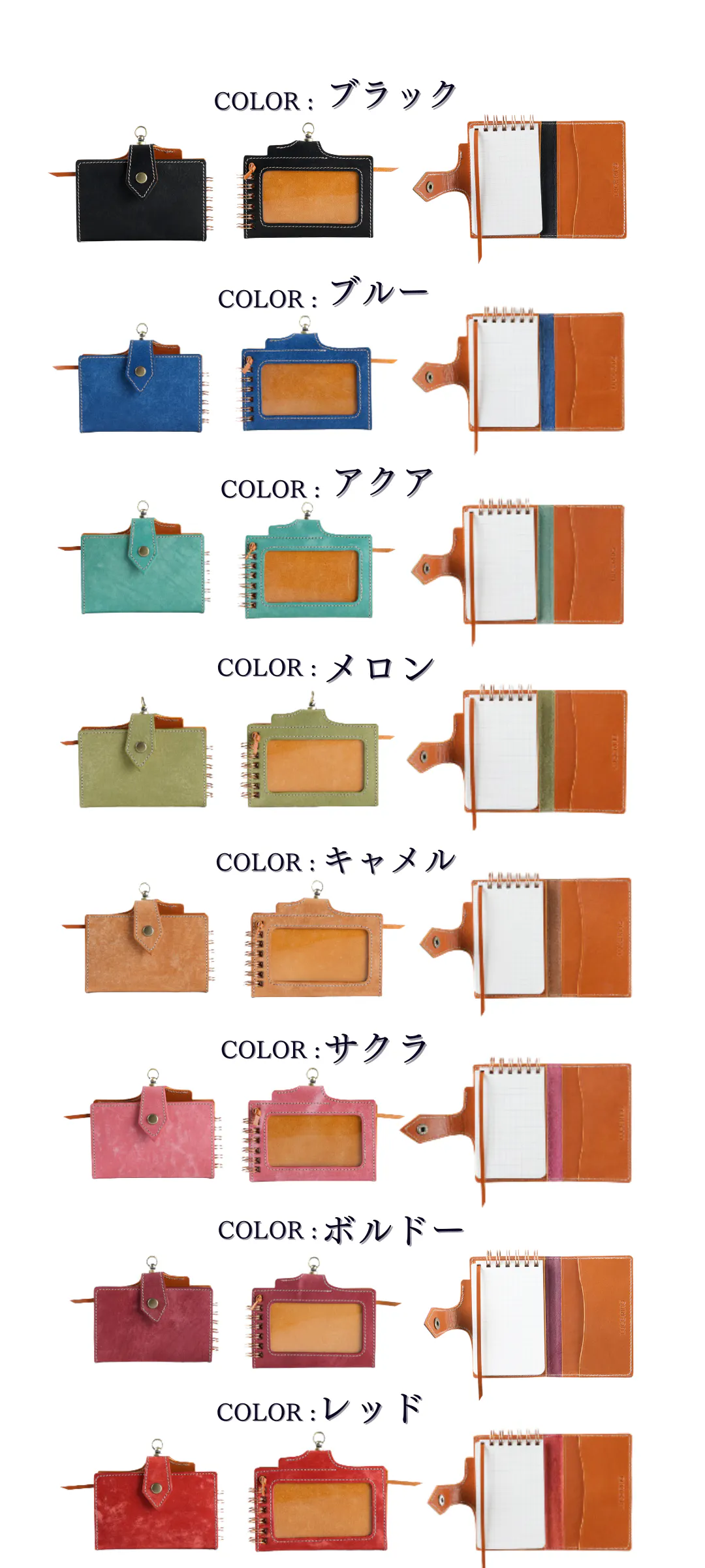 表面カラー8色(ブラック、キャメル、ブルー、レッド、サクラ、メロン、ボルドー、アクア)は、イタリアのレザー「マヤレザー」を使用