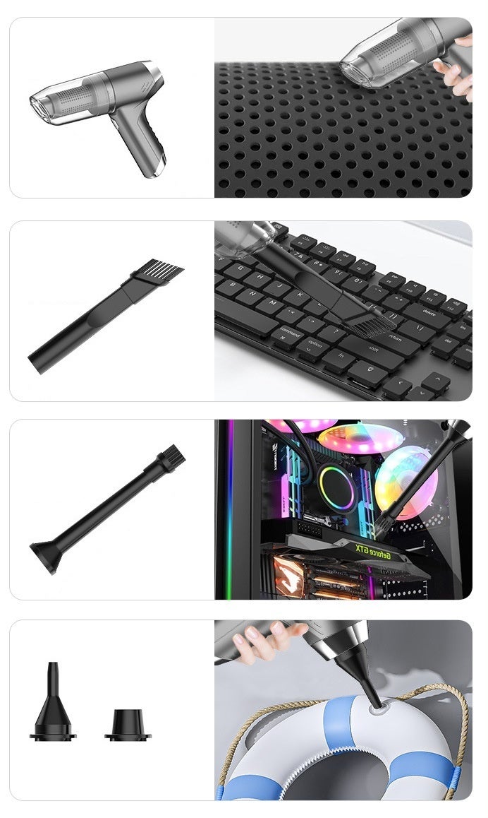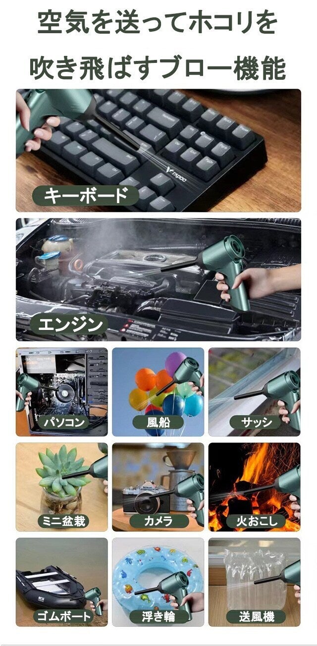2つの機能、クリーナー・エア噴射を備えたこのミニ掃除機は、豊富なノズルと高出力の強力なエアで車内を清掃します。また、19500PAの強力な吸引力も特徴の一つです。車内だけではなく、自宅やアウトドアで幅広く活用できる軽量設計です。