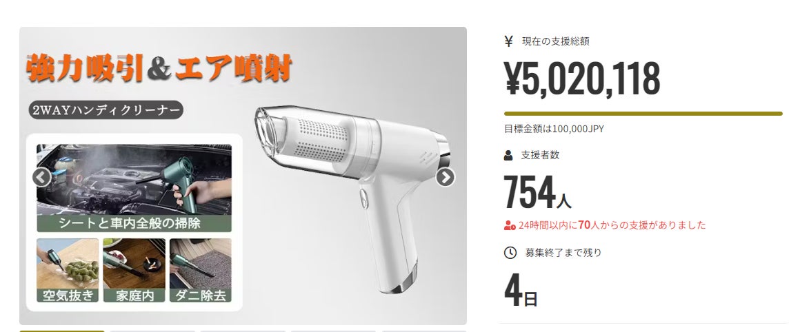 皆さま、おはようございます。この度は「車をいつもきれいに!2WAYエア噴射と強力吸引力コードレスミニ掃除機OUNAIⅡ 」にご支援頂き誠にありがとうございます!この度、たくさんのご支援をいただき誠にありがとうございました!!無事に終了いたしました。ご協力いただきました皆さま、本当にありがとうございます。1日も早く、皆様の元に商品をお届けできますよう準備を進めてまいります。引き続きどうぞよろしくお願いいたします。