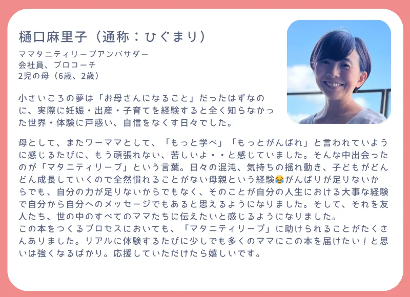 ・これまでワークショップやインタビュー、コーチングを通じて多くのママのリアルな声をたくさん聞いてきました。そして、そのプロセスでママたちが飛躍する姿も何度も目にしてきました。そんなリアルな声や体験をもとに、執筆しています。