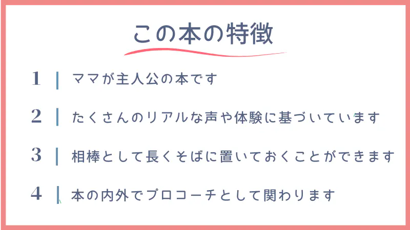 ・全員ママであることに加えてもう一つの著者の共通点が、プロコーチであること。ワークはすべて私たちがオリジナルで作成し、プロコーチならではの問いかけや声かけにもあふれた本になっています。まるでコーチングを受けているような体験ができます。