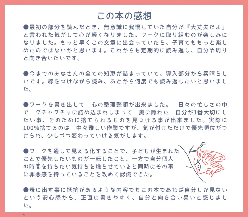・一度最後までやり切ったとしても、またしばらくして、何か変化を感じたり、立ち止まって考えたいなと思ったら、再度ページを開いてもらえれば新しい発見がそこにあるはずです。