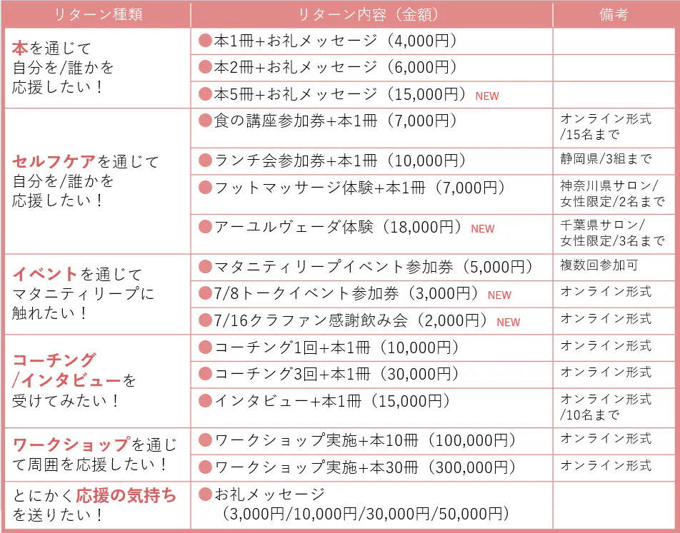 リターンについては、私たちのプロジェクトへのご支援に対する感謝の気持ちを表したものになっています。私たちの活動や出版内容に応援の気持ちを送っていただけるもの、私たち自身がプロコーチであることを活かした内容、私たちを応援してくださる方からのサポートなど、さまざま。