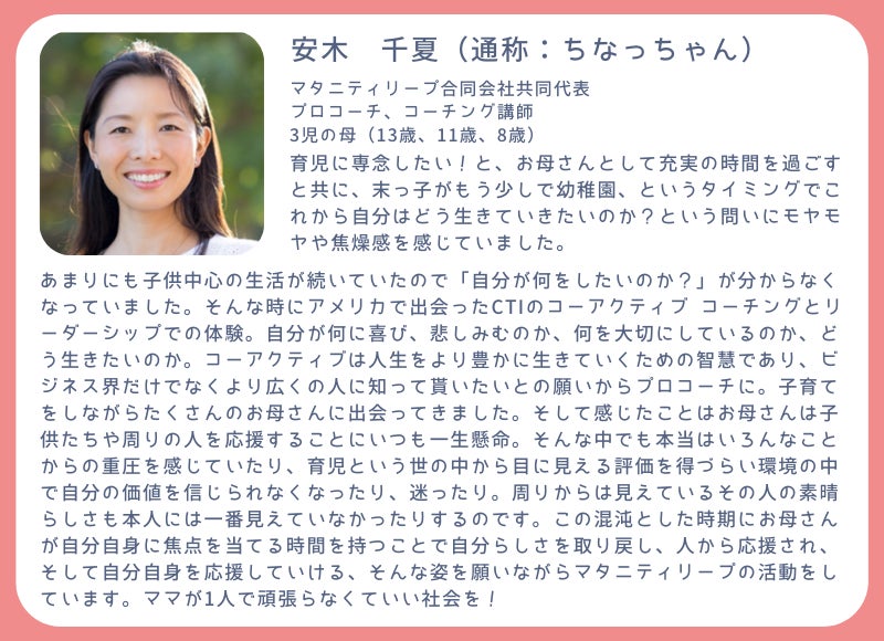 今、抱えているモヤモヤや混沌こそが成長へのヒントをくれ、これからの自分を生みだすのです。そして、そのプロセスを通じてママたちが自分の可能性に気づき、自分の人生にワクワクするような変化を起こすことができるという確信もあります。