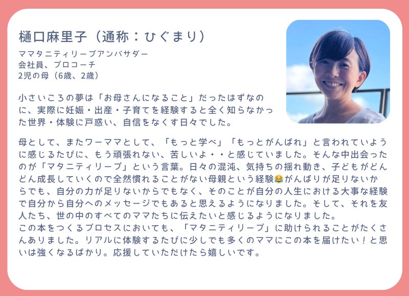 また、私たちはママを応援する人たちにもエールを送りたいと思っています。頑張るママを応援する周囲の方が、この本をプレゼントすることでその気持ちを伝えることができる、そんな存在になれば嬉しいです。