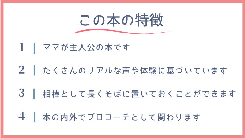 ・全員ママであることに加えてもう一つの著者の共通点が、プロコーチであること。ワークはすべて私たちがオリジナルで作成し、プロコーチならではの問いかけや声かけにもあふれた本になっています。まるでコーチングを受けているような体験ができます。