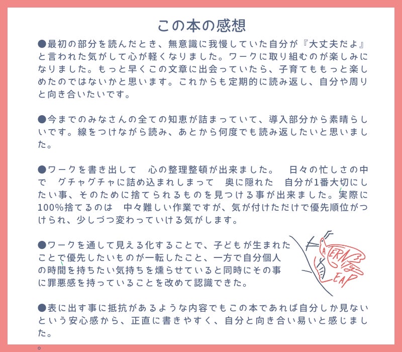 ・その時々のタイミングや状態、気持ちにあわせて読み進めたり、ワークに取り組むことができます。