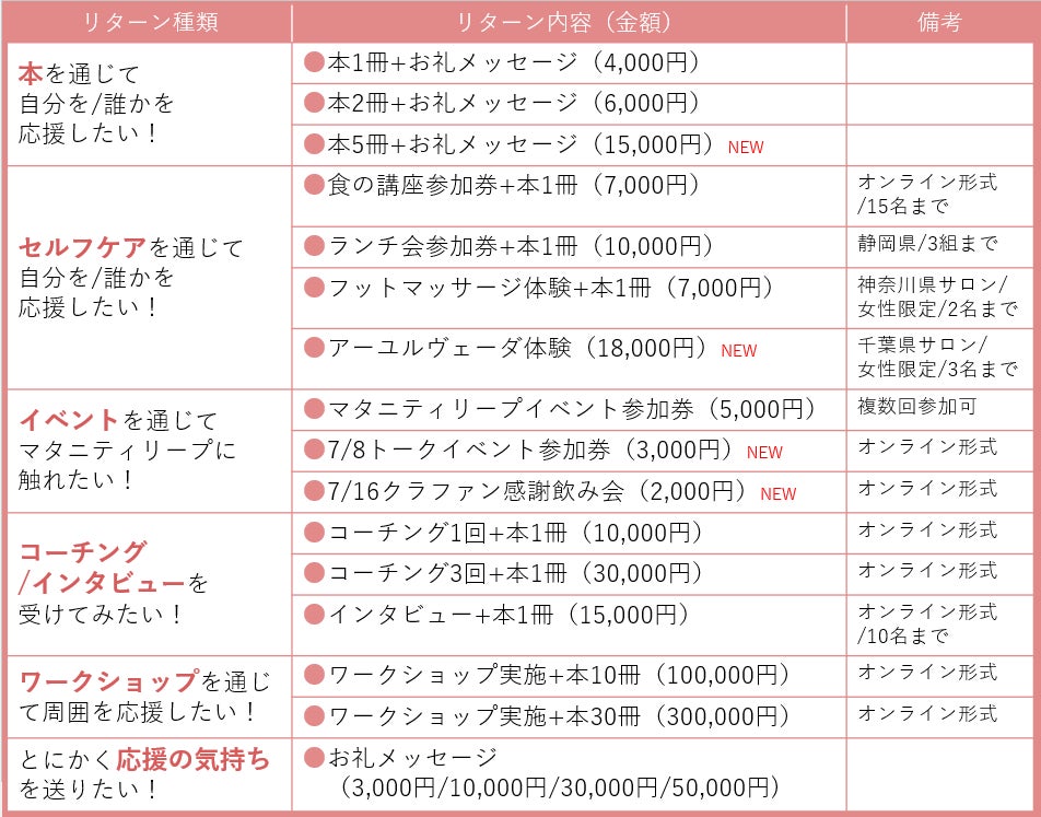 リターンについては、私たちのプロジェクトへのご支援に対する感謝の気持ちを表したものになっています。私たちの活動や出版内容に応援の気持ちを送っていただけるもの、私たち自身がプロコーチであることを活かした内容、私たちを応援してくださる方からのサポートなど、さまざま。