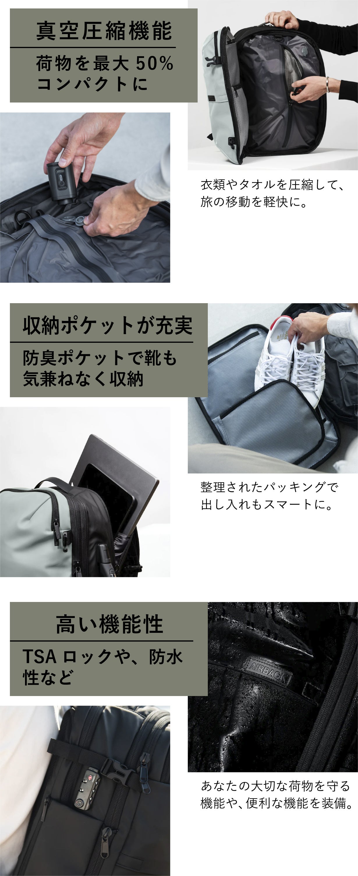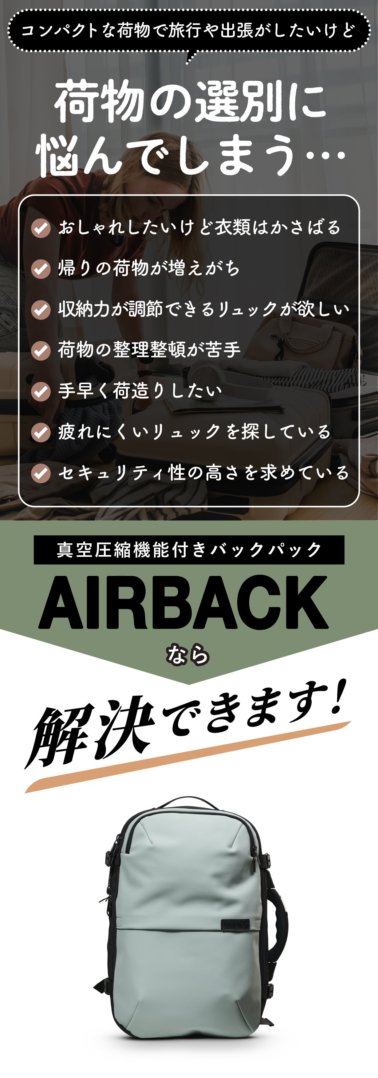 世界に散らばる新しいユニークな製品を探す中で、私たちは、旅行のストレスを軽減し、より快適な体験を提供できるバックパック「AIRBACK」に出会い、その革新的な真空圧縮技術が、荷物の詰め込みに苦労し重量制限に悩む旅行者のために役立つと確信し、このバッグを日本市場に紹介することが私たちの使命だと感じました。旅の自由度を高めることで、より多くの人々に新しい旅行体験を提供したい、旅行の楽しさと快適さを皆さんにお届けしたいと考えています。