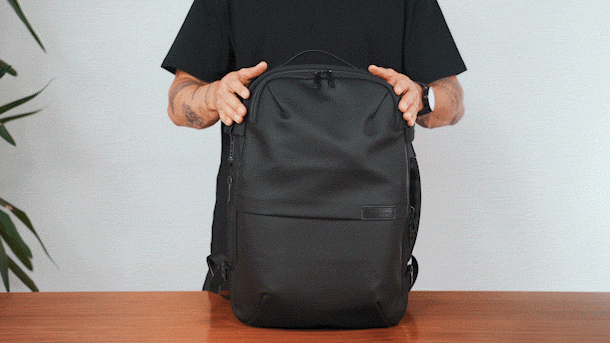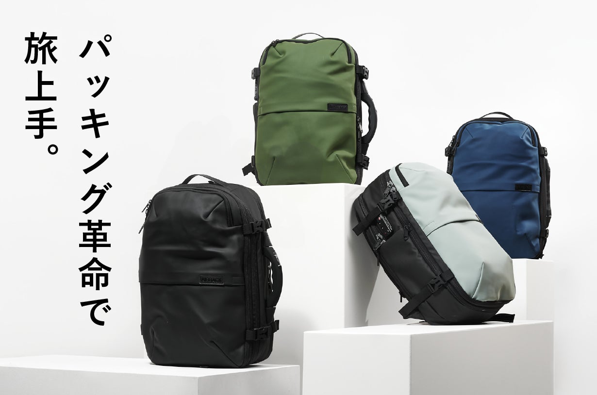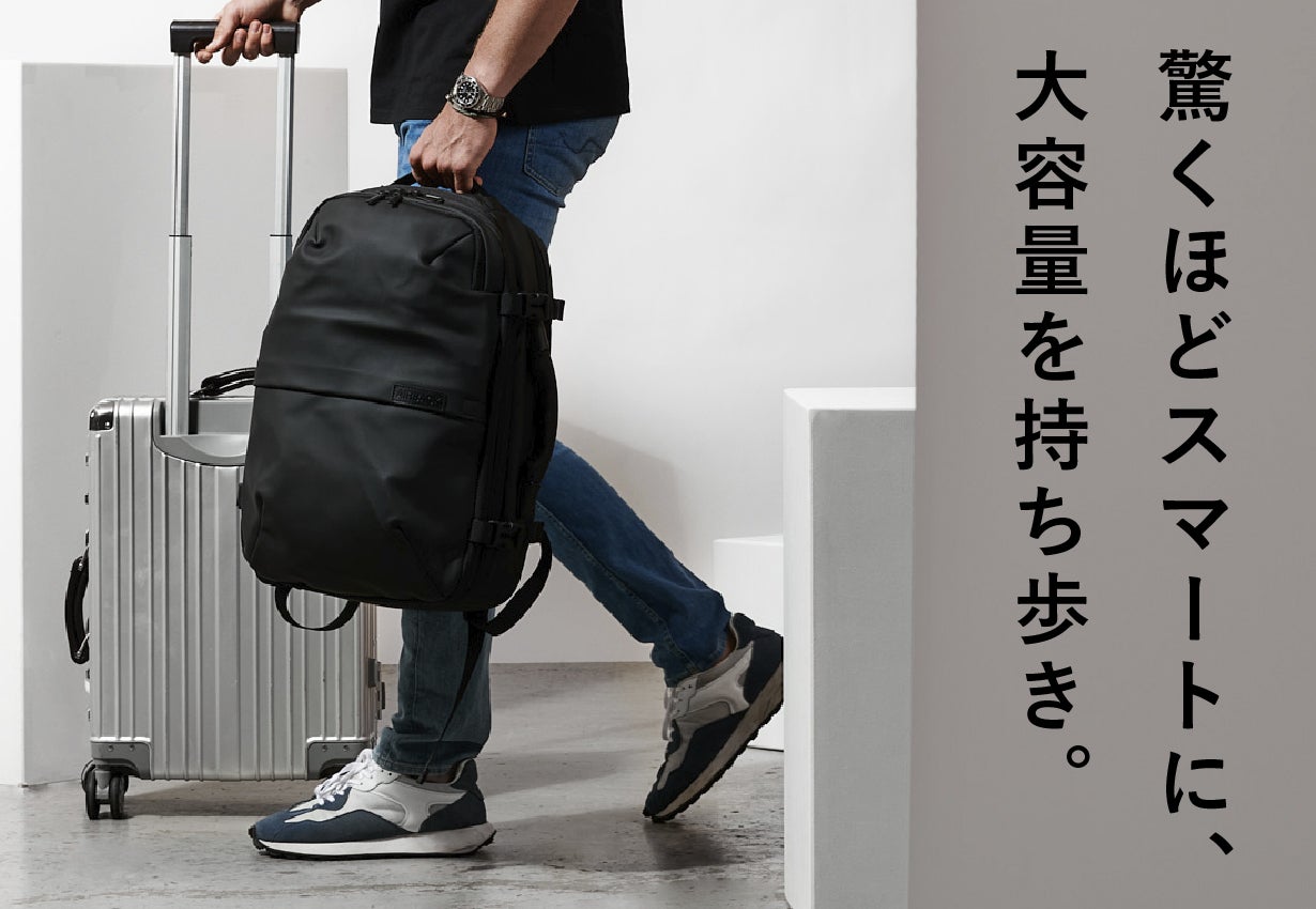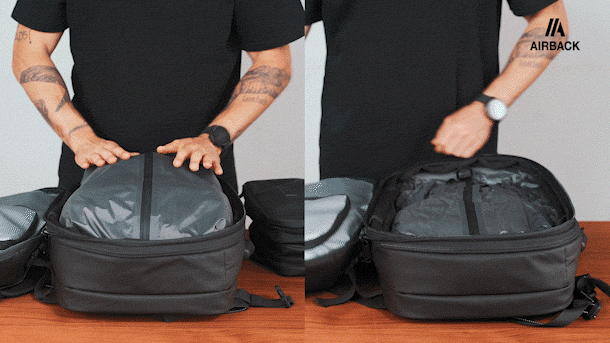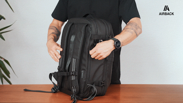 A: AIRBACKのバッグの最大容量は60Lで、サイズ拡張ジッパーで22L〜60Lまで調節可能です。