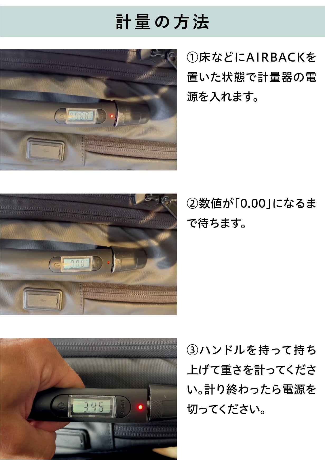 ※計量器は中に入れた荷物の重さだけを計量します。AIRBACK本体も入れた重量を知りたい場合には、計量器に表示された数字に1.9kgをプラスしてください。