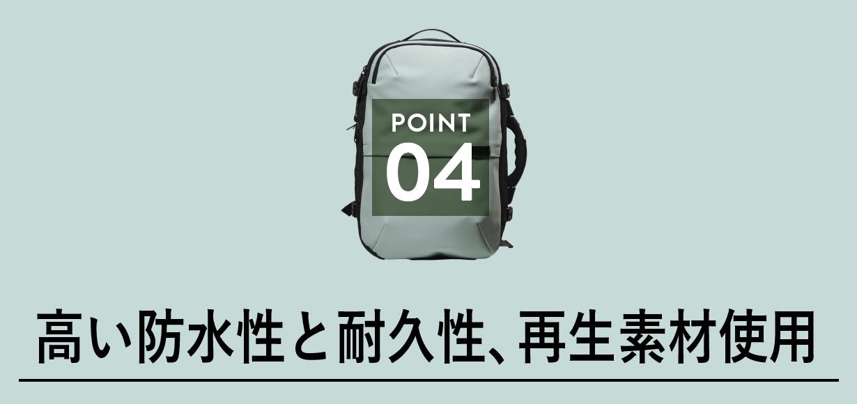 ジッパー部分も耐久性が高く、バックル部分は特殊コーティングで耐久性を強化しました。ポリエステル部分はリサイクル素材を使用しており、環境にも配慮しています。