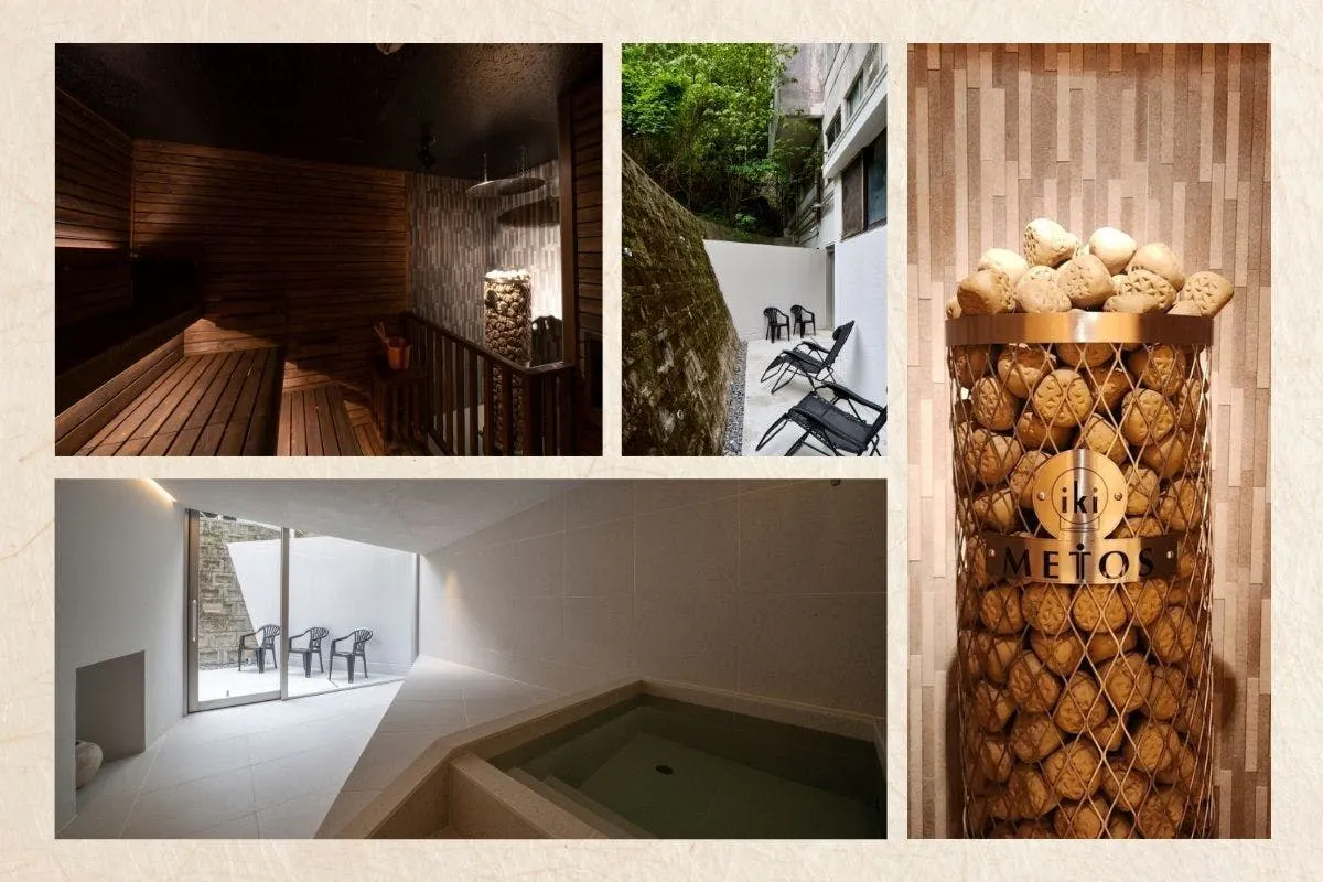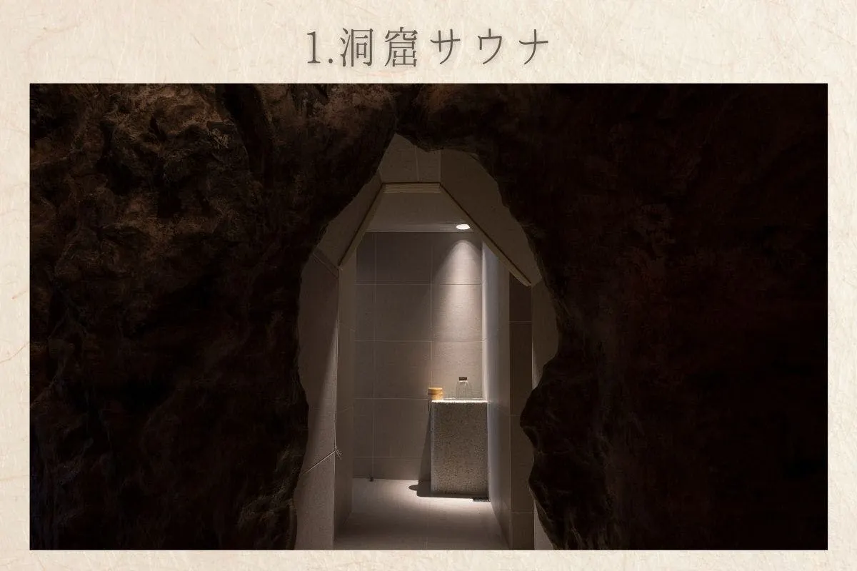 平野屋の温泉大浴場「洞窟風呂」に併設された、明と暗のコントラストが美しいサウナ空間「洞窟サウナ」です。迫力ある洞窟は平野屋建設当時に作られたもので、今は作ることが難しい貴重なお風呂なんです。暗い洞窟を抜けると、その先には白を基調としたととのい空間が広がります。サウナヒーターはMETOS社の「IKI」を採用。美しいデザインと迫力の熱波で、セルフロウリュをお楽しみいただけます。