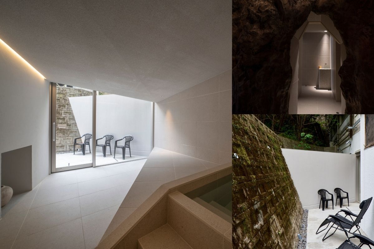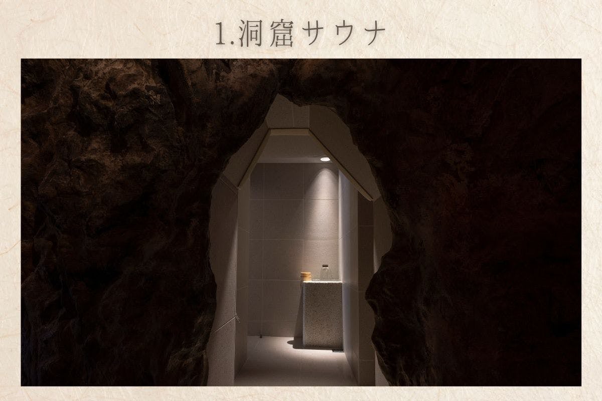 暗い洞窟と、白いサウナ空間。