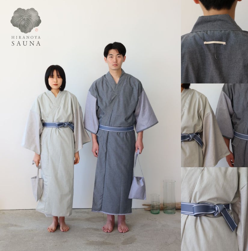 生地は、薄手で軽く肌触りの良いタンガリー生地を採用。身頃と袖は淡いペールトーンのバイカラーバイカラーで、袖口と裾にパイピングを施しました。襟裏には生成色のタグをアクセントで配置し、ファッションを浴衣に落とし込んだデザインです。
