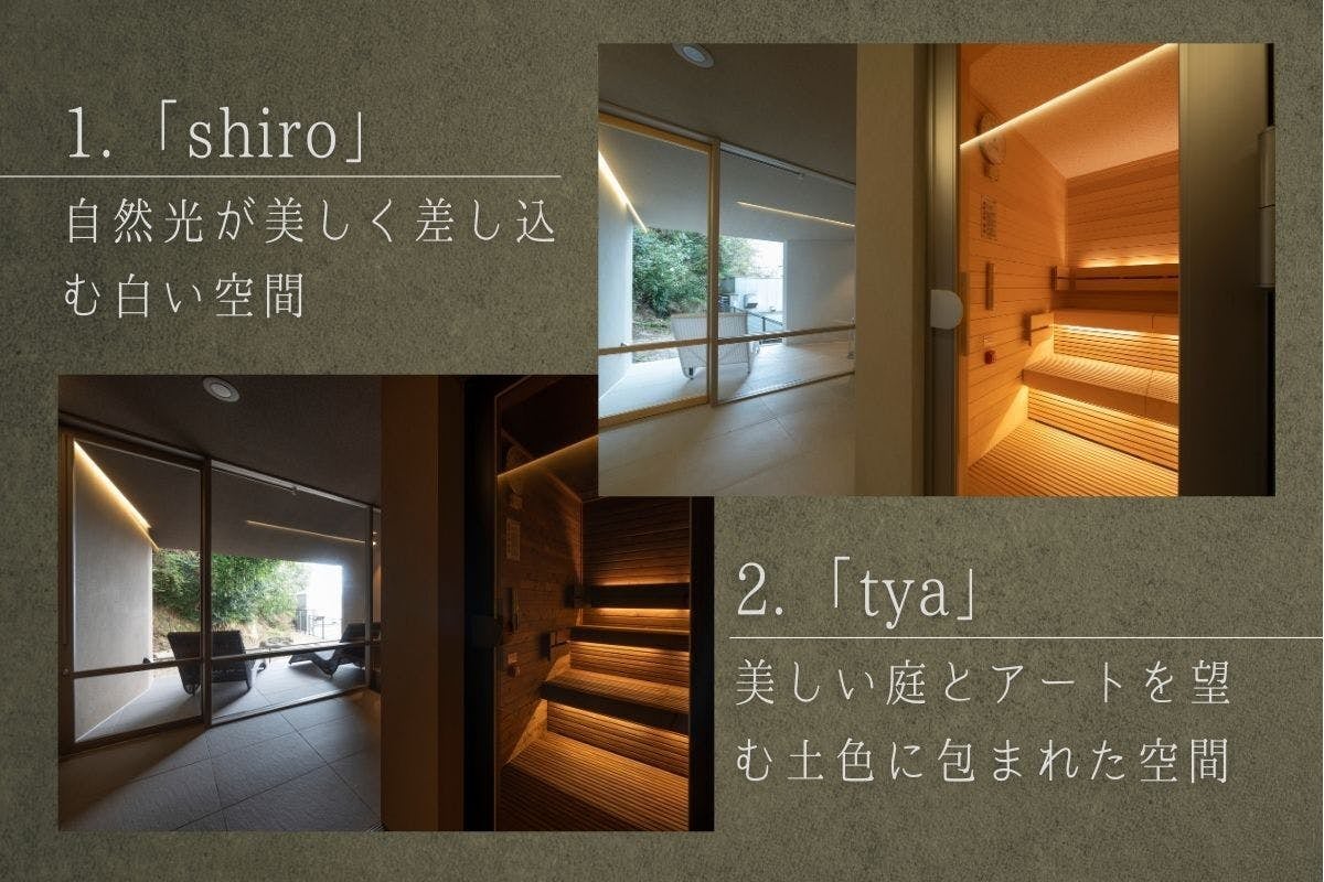 貸切プライベートサウナは、「tya」「shiro」の2室。どちらもプライベートな空間で最高のととのい時間をお過ごしいただけるよう、温度や照明などをカスタマイズできる特別仕様の空間となっています。