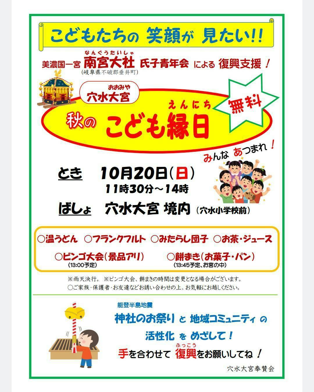 10月20日(日)、秋のこども縁日を穴水大宮(神社)で開催します。