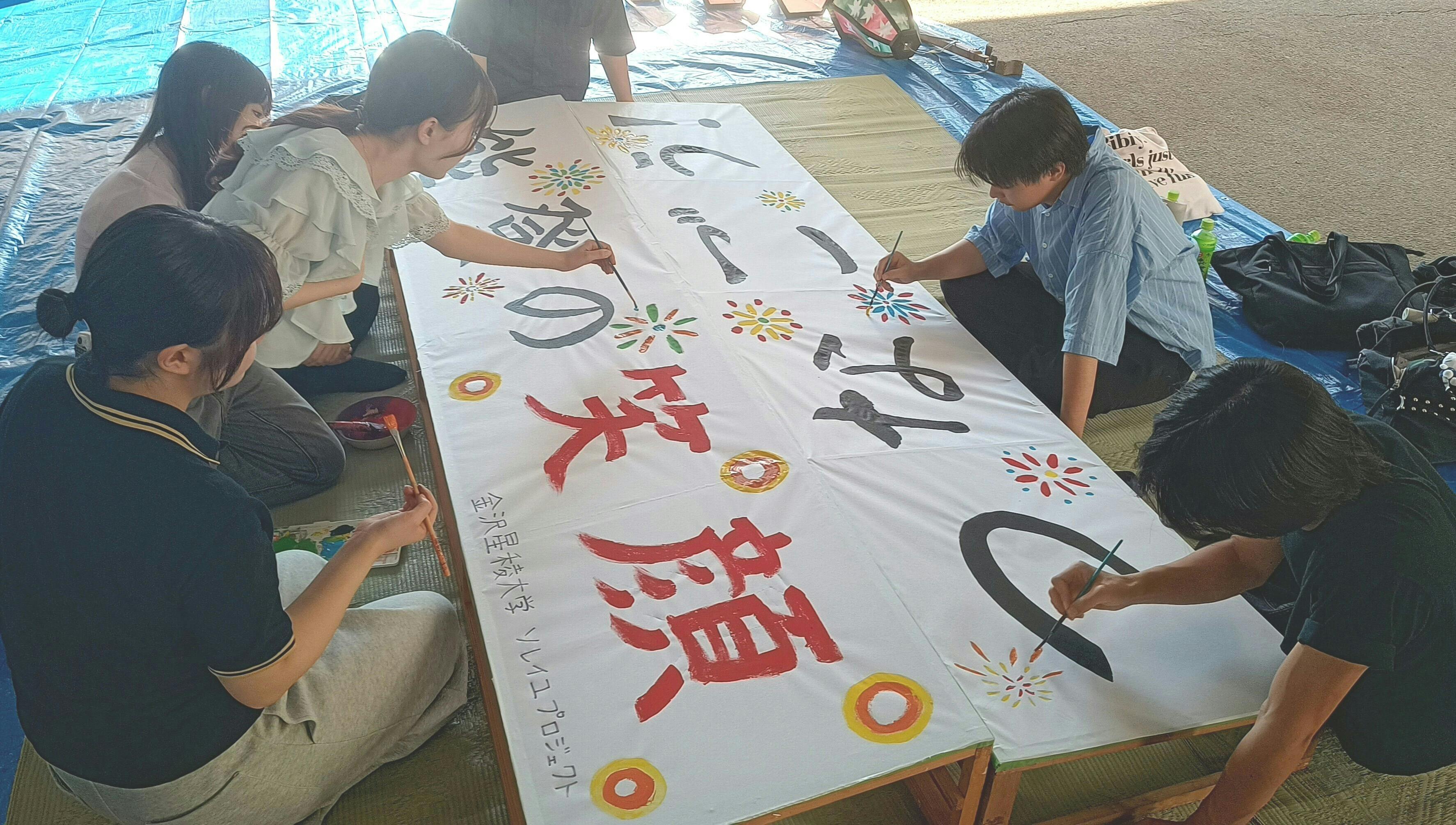 山車の文字を書いてもらい、御神輿を担ぎ、若さあふれる姿で穴水町のお祭りを盛り上げてくれました。