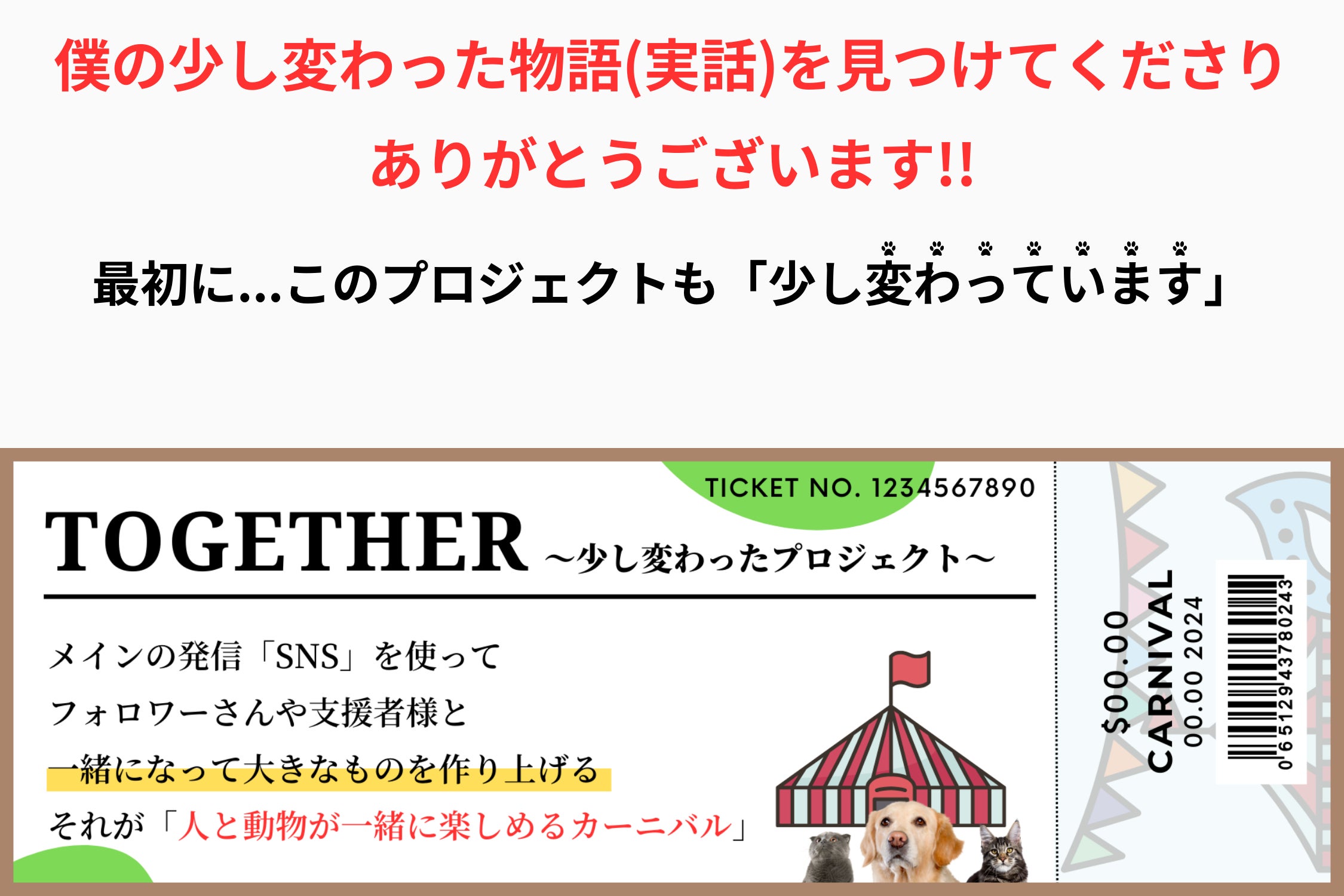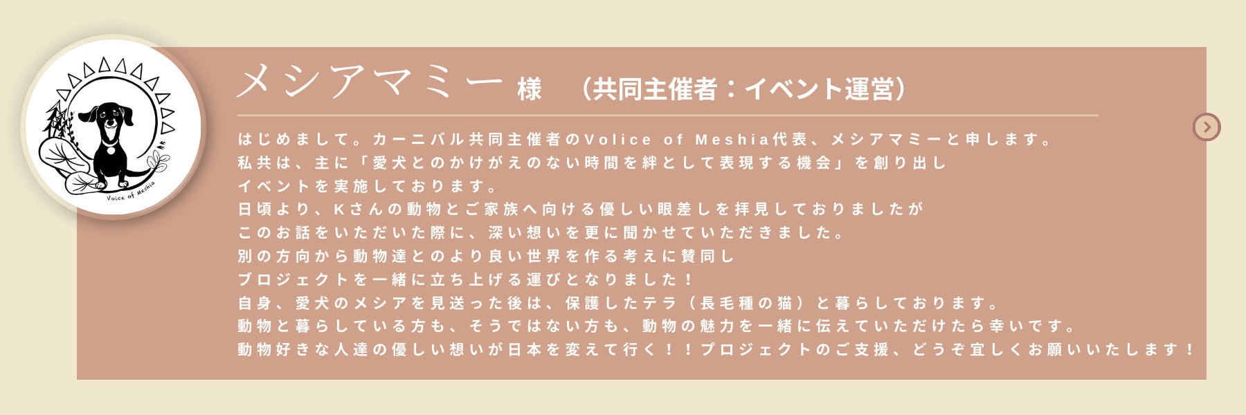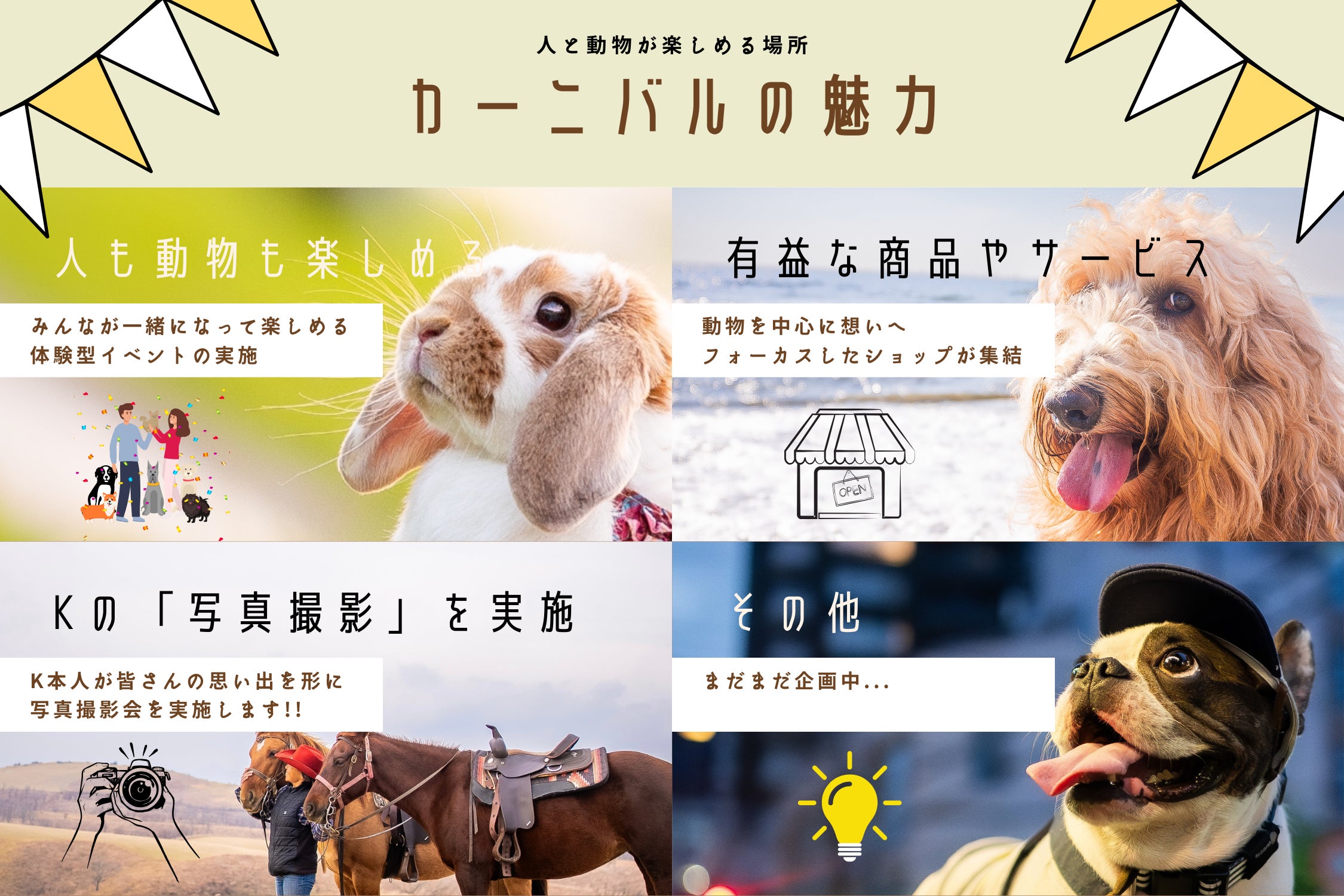 今年10月頃より人と動物が一緒に楽しめるカーニバルを全国で開催するために、僕たちは家族との「思い出」にフォーカスを置いた新しい形のイベントを創り上げることを目指しています。人々が心温まるひとときを過ごす場を提供し、同時に動物たちにも幸せな体験を提供することで、社会全体の幸福度向上と共に人と動物がより暮らしやすい世界を創作したいと考えています。