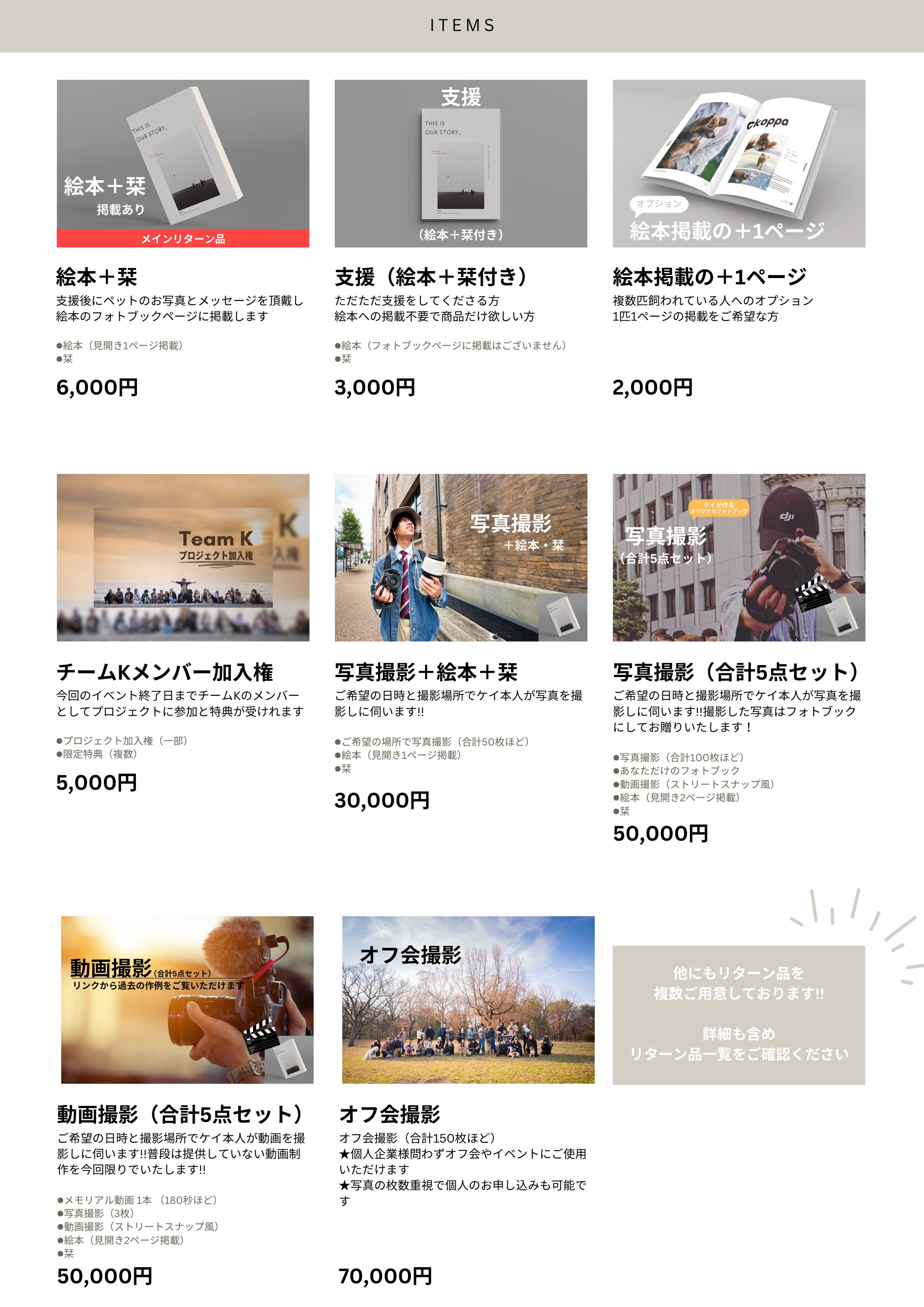 基本的なリターンには「支援者とケイが主人公となった絵本(フォトブック)」と「栞」が付いております。表紙はインテリアとして飾っていただきいつでも誰でも見返せるデザインになっております。
