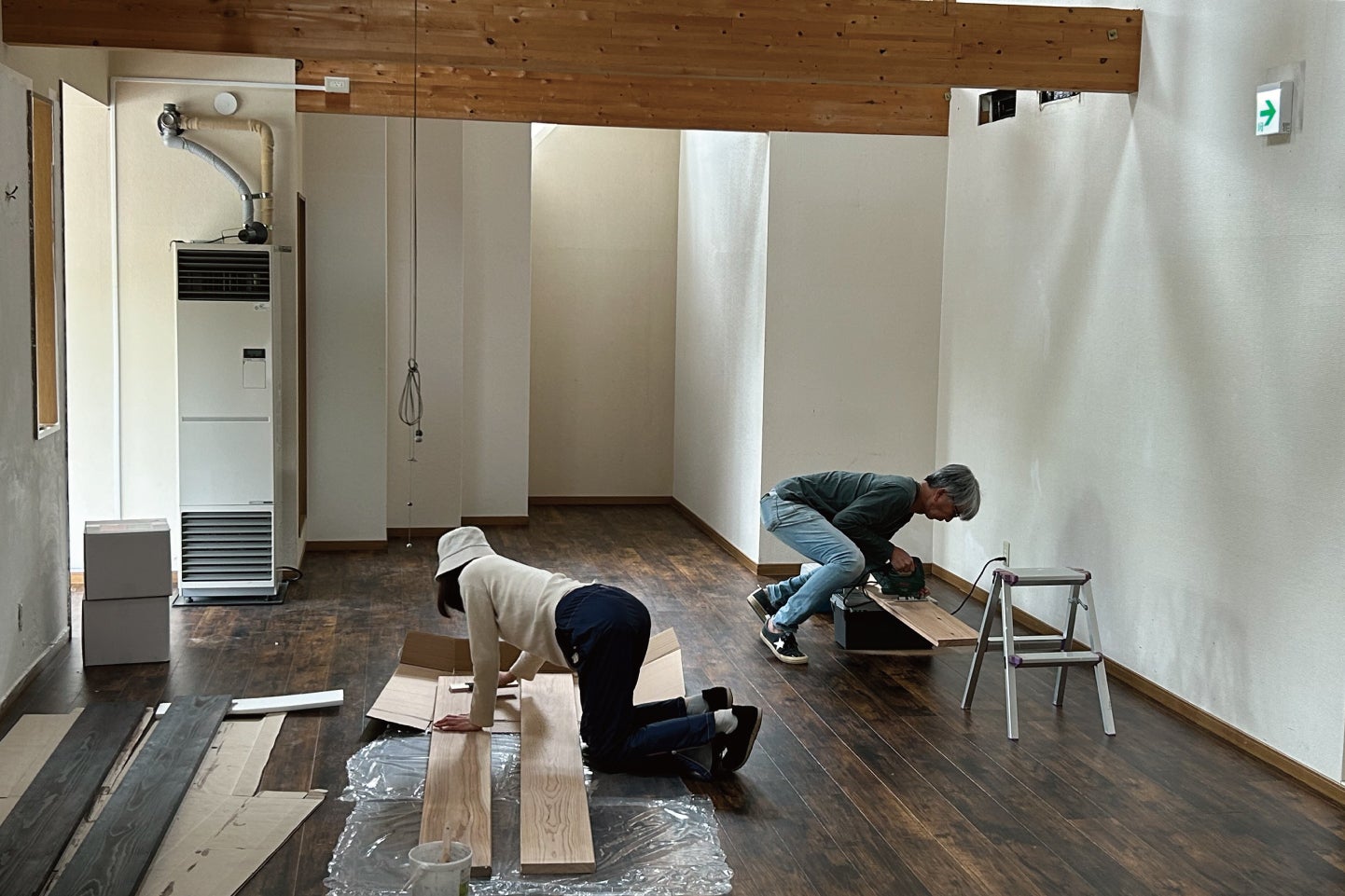 東京からはるばる工具とともに応援にきてくれたYさんと木材を搬入。やすりがけして、柿渋からできた自然塗料で3度塗り。
