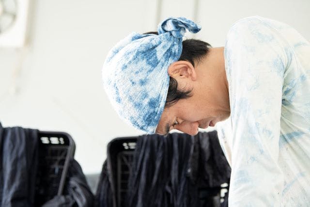 藍染製品には、職人のこだわりが凝縮されています。今回のワンピースの染めは一着ごとに約20数回もの染め作業を繰り返し、細心の注意を払いながら絶妙な色合いを生み出します。染めた衣服を干して‟酸化させる”工程においても、染色プロセスに大きく影響する「湿度」や「天候」を見極めながら、慎重かつ時間をかけて酸化作業を行います。最適な湿度・天候で行うことで最も美しい色合いを実現し、酸化時間を十分に確保することにより柄をはっきりと際立たせることができます。こうした工程を経て、こだわり抜いた最高品質の藍染作品を創り上げています。
