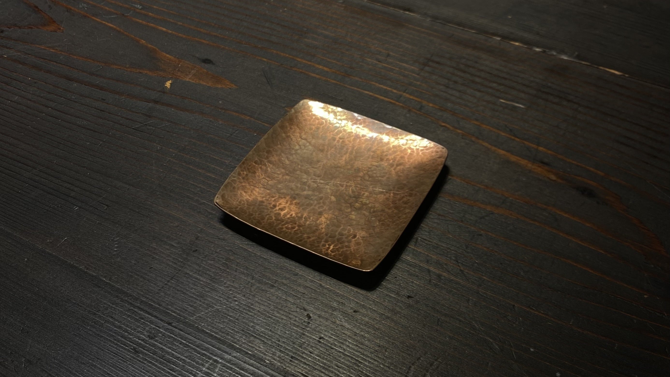 伊勢神宮、北野天満宮、湯島天神、大阪城、名古屋城等、全国の寺社仏閣の飾り金具を手掛けた京都の錺り職人、中江隆司氏が制作する槌目の豆皿です。1枚の銅板を切り出し、全て手作業で仕上げます。