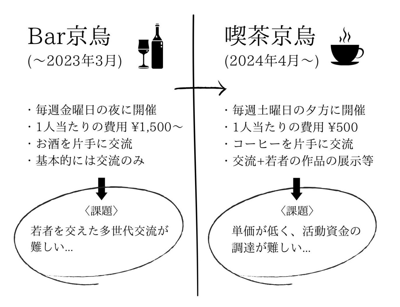 これまでに開催されていた「Bar京烏」とは異なり、「喫茶京烏」では、大学生の活躍の場としてはもちろん、コーヒーというコミニュケーションツールを通じてものづくりに携わる多世代・多業種の方の交流が生まれる場を目指します。