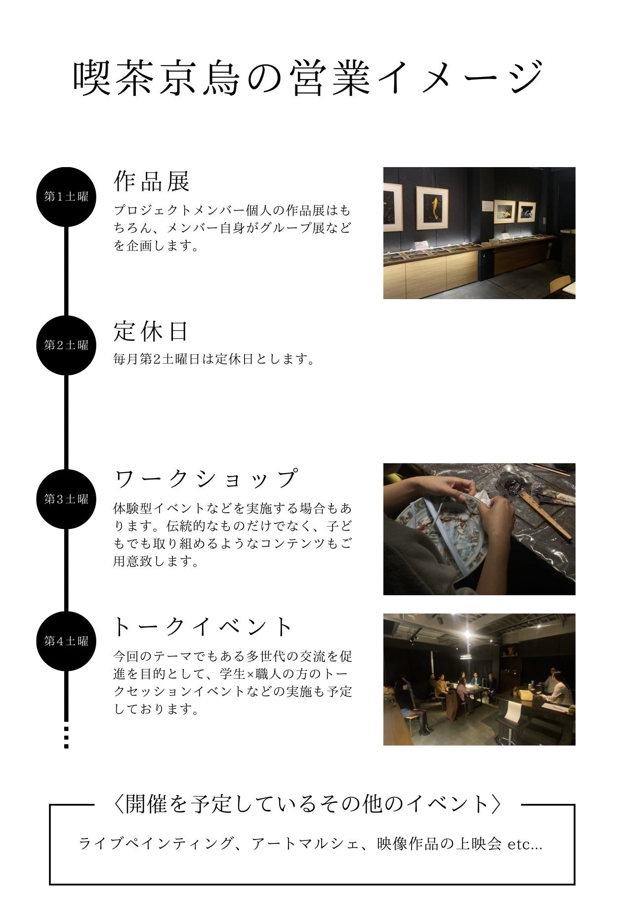 本プロジェクトでは、「ギャラリー京烏」を活用し、「 喫茶京烏 -珈琲と、ものづくりのお店- 」 として、毎週土曜日の営業を予定しております。( 第2・第5土曜日はお休みの計月3回 )