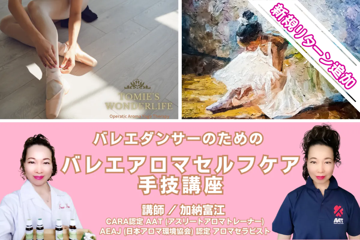 バレエアロマトレーナー 加納富江のバレエダンサーのためのバレエアロマセルフケア手技講座を限定20名にご用意しました。