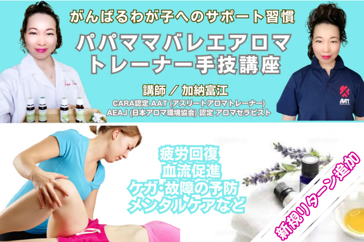 バレエアロマトレーナー 加納富江のがんばるわが子へのサポート習慣 パパママバレエアロマトレーナー手技講座を限定20名にご用意しました。