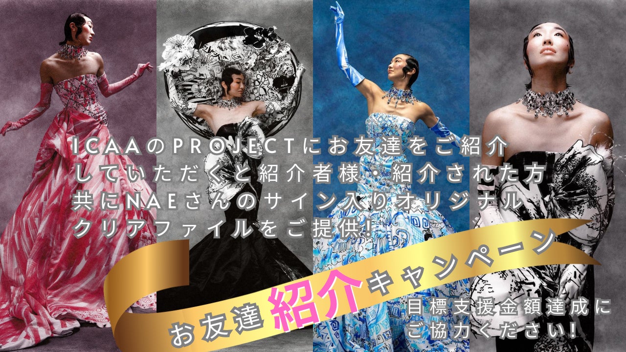 ICAAのPROJECTにお友達をご紹介していただくと紹介者様・紹介された方共にNAEさんのサイン入りオリジナルクリアファイルをご提供致します。(既にご支援頂いている方同士でも可。ご紹介1回につきクリアファイル1つご提供致します)