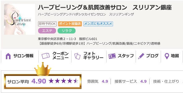 ホットペッパービューティーでは銀座高評価口コミランキング320店舗中1位獲得(2023年3月現在)。