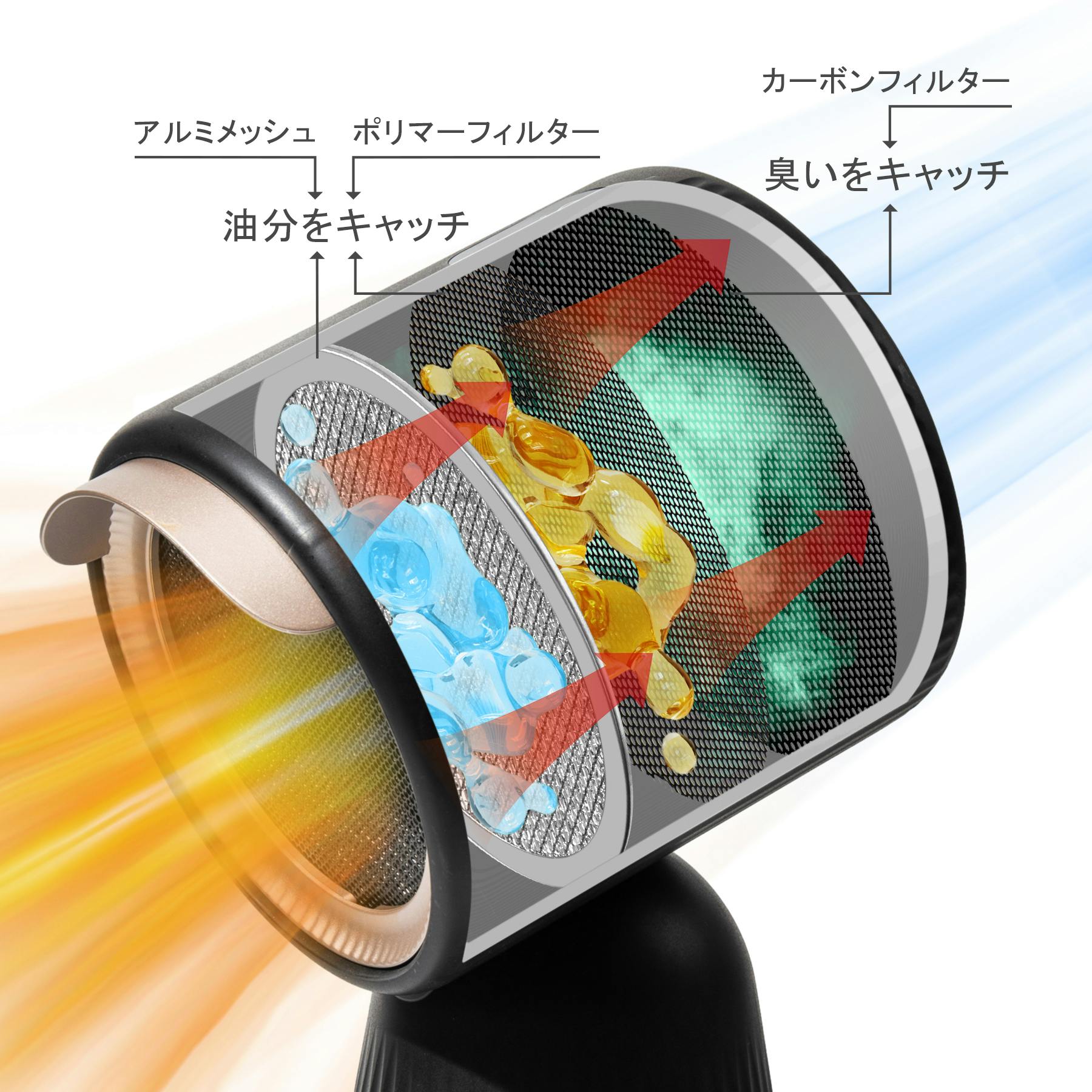 アルミメッシュと微小なポリマーフィルター、カーボンフィルター3層の立体構造で汚れた空気をろ過、室内空気を快適に保つ。アルミ製メッシュが油けむりを冷却し、ポリマーフィルターが油を絡め取り、湯気と油を分離させ、3枚目のカーボンフィルター(活性炭フィルター)が残った空気のニオイを吸着します。