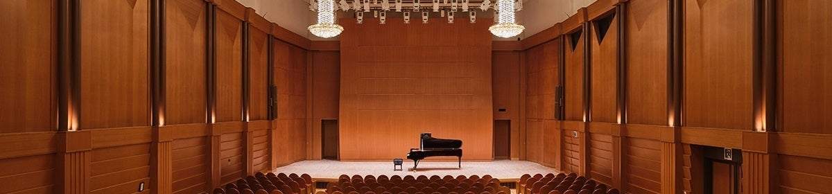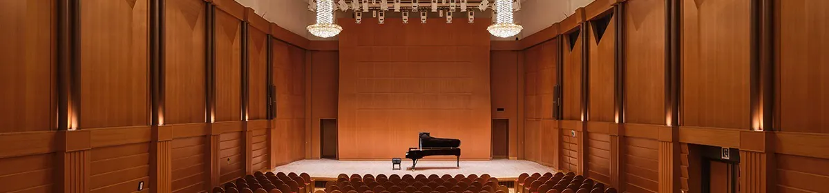 440席の小ホールは、可動式残響調整板を備えたシューボックス型。ヨーロッパの貴族たちのサロンを思わせる、親密な空間です。浮き床構造によって外部からの騒音を完全に遮断。室内楽や、ピアノ・声楽などのリサイタルなど繊細な音色には最高の音響です。