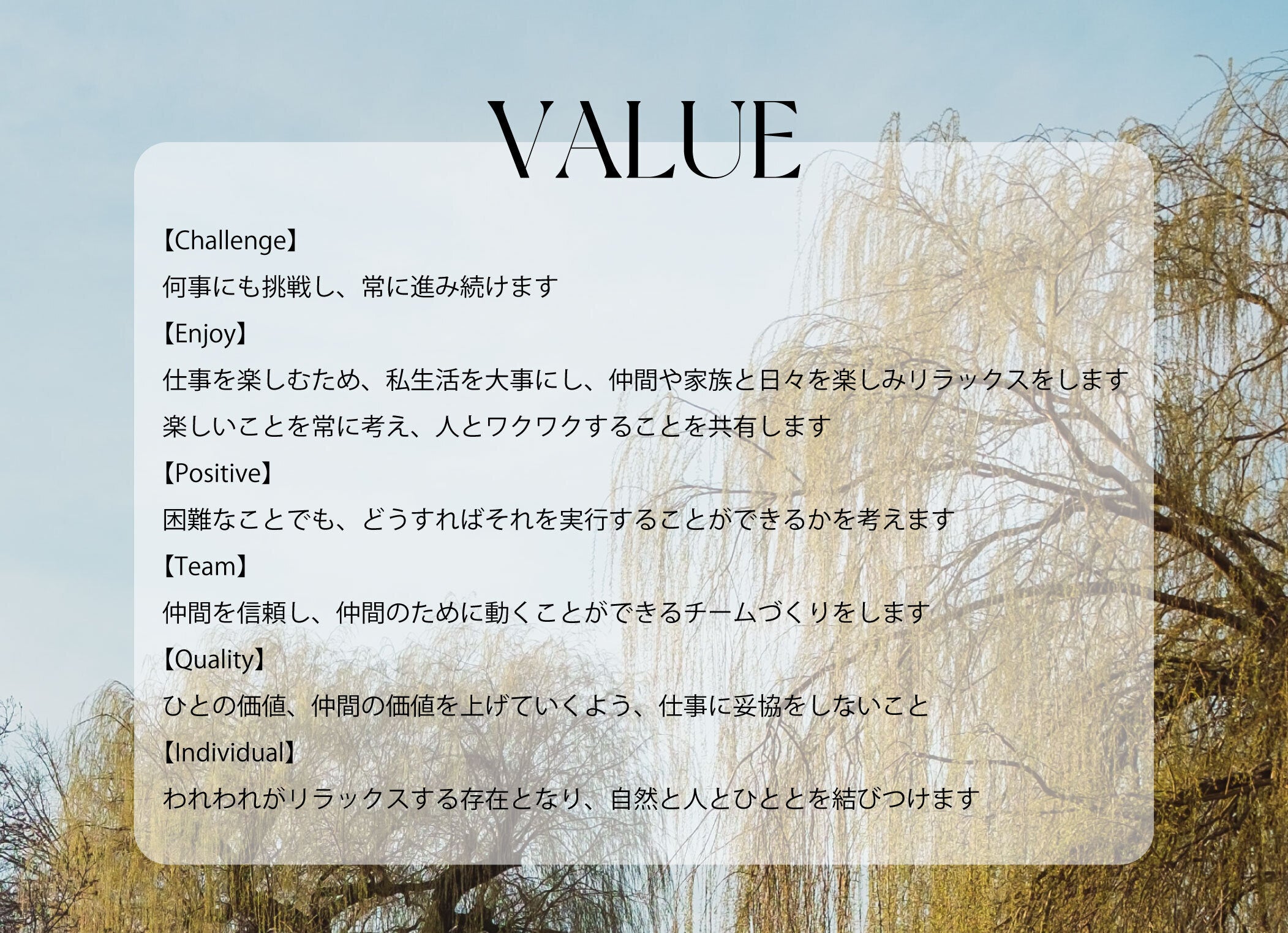Willowに関わる全ての人々の生活に「安らぎ」と「情熱」のバランスを整え、世界中の誰もが自分らしく”ありのままで” 輝いて生きていける社会を創ることを目指します。