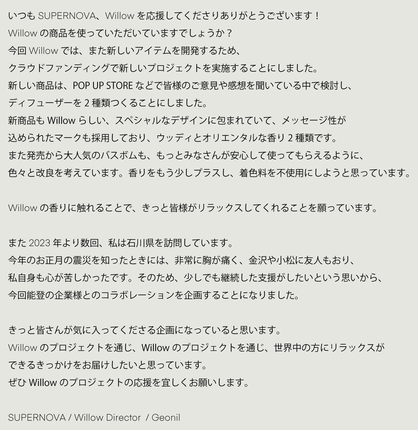 成分や香り、またWillowの真骨頂であるデザインにこだわり、皆様の生活にリラックスをするきっかけを与えることができれば幸いです。