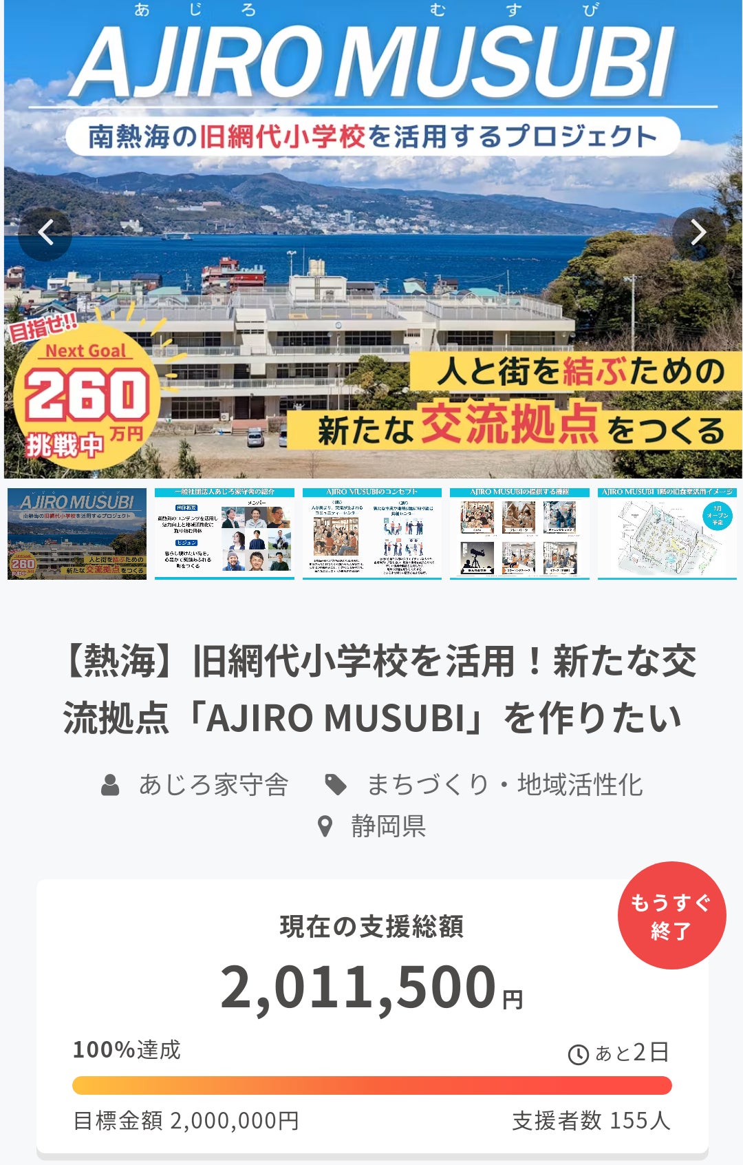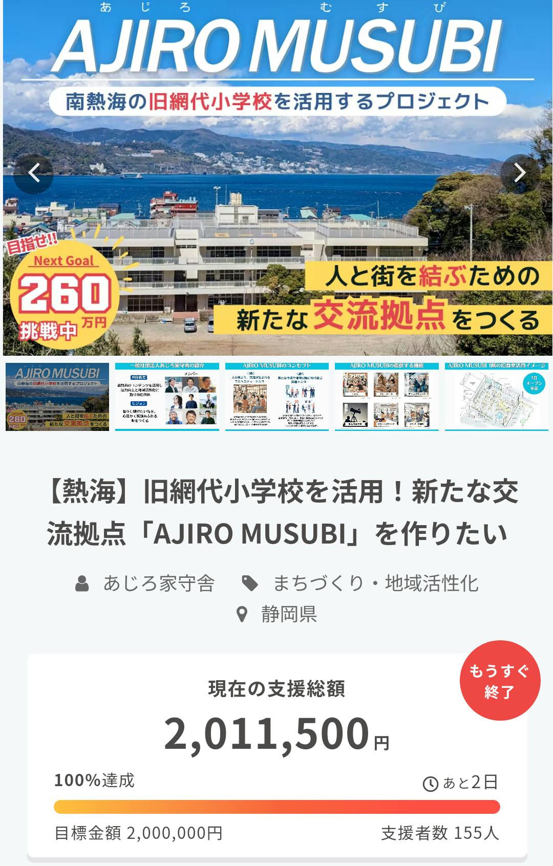 あじろの「じ(2)ろ(6)」に思いを込めて、260万円という金額に設定しました。残り僅かな時間ですが、達成できるかわかりません。しかし、南熱海の拠点として素敵な場所を作り上げるため、クラウドファンディング終了の5月31日(金)まで走り続けます!