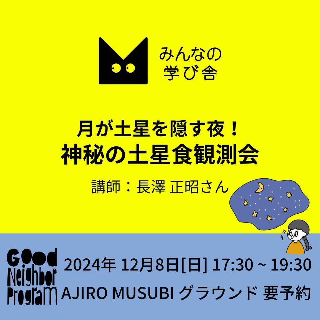 月に土星が隠れる瞬間を一緒に見よう!天体望遠鏡で土星食を観察し、天体の不思議に触れる特別な夜をお届けします。今回のイベントでは、中心となって天体望遠鏡の操作方法を学び、実際に自分の手で宇宙を覗く体験ができます。星空の下、土星が月に隠れる神秘的な瞬間を目撃しながら、天体観測の楽しさと驚きを感じてみませんか?