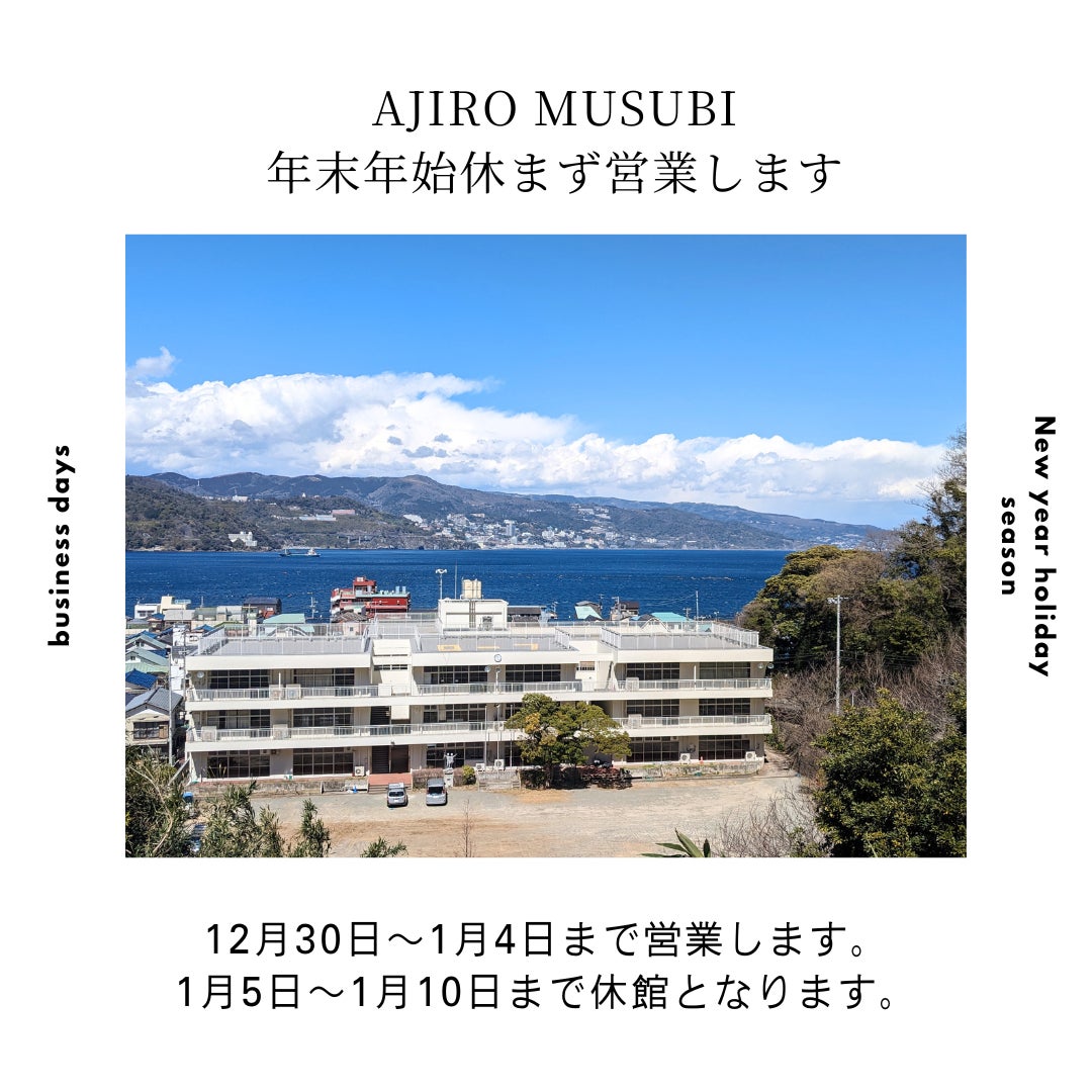 AJIRO MUSUBIは、1月4日まで休まず営業いたします!お近くにお越しの際は、ぜひお気軽にお立ち寄りください。地域の温かい雰囲気とともに、皆さまのお越しを心よりお待ちしております。また、来年度も多くのイベントを実施し、地域の皆さまや訪れる方々との交流を深めてまいります。引き続き、どうぞよろしくお願いいたします!今後のイベント情報です!■12月28日(土)むすび落語会江戸の女流落語家で最年少!  桂南海(カツラナンシー)さんによる笑いあふれるひとときを一緒に楽しみましょうお申込みhttps://forms.gle/oa6ReQmn8wzRroze7■1月1日(水)朝日山公園 初日の出の集い 新年の輝きをその目にかつて300人以上が集まり、新年の初めを祝った朝日山公園。今では知る人ぞ知るこの特別な場所で、初日の出を皆で迎えるイベントを開催します。詳細はコチラhttps://www.ajiromusubi.jp/archives/news/735■1月11日(土)新春餅つき&書初め!新年の始まりを祝う、楽しいひとときを過ごしませんか?餅つきで力を合わせて餅を作り、書初めで新しい年の目標を揮毫!書道家によりパフォーマンスも実施!詳細はコチラhttps://www.ajiromusubi.jp/archives/news/737■1月18日(土)みんなの学び舎実はうまかった!網代の未活用魚を知る・味わう海の隠れた宝で、新しい食の楽しみを発見しようお申込みhttps://forms.gle/zNYzm7syz4DVKSKG7■1月19日(日)むすびマルシェ出店お申込みhttps://forms.gle/gazouJZAKq8RqkrS8■1月25日(土)みんなの学び舎心を整える茶会 お抹茶と間瀬さんのお菓子で過ごすひとときお申込みhttps://forms.gle/XRncccnXJfBa5pBN7