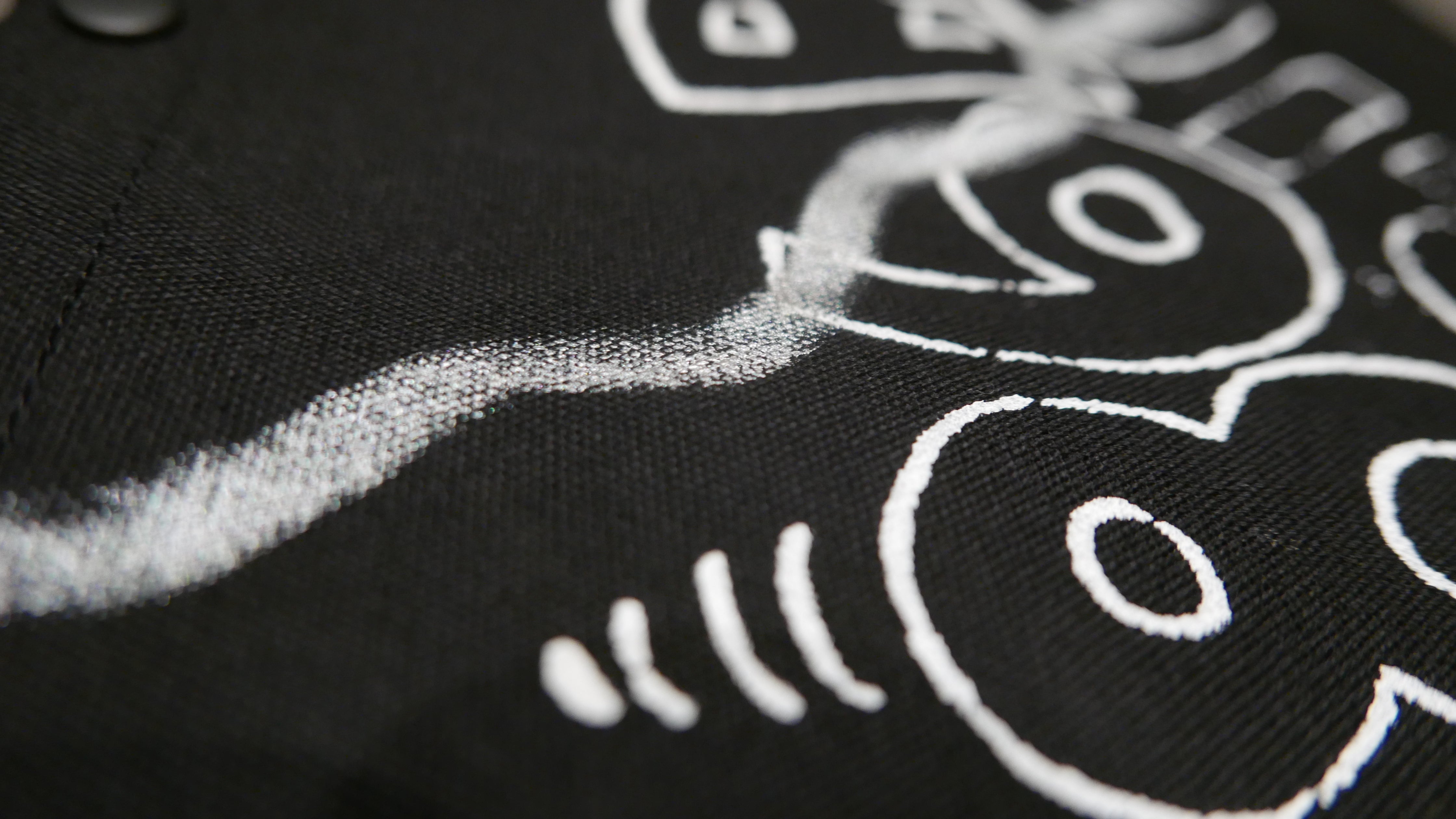 綿100%、ハンドプリント、シルクスクリーン(白ラバーインク)、ハンドペイント(シルバーラバーインク)