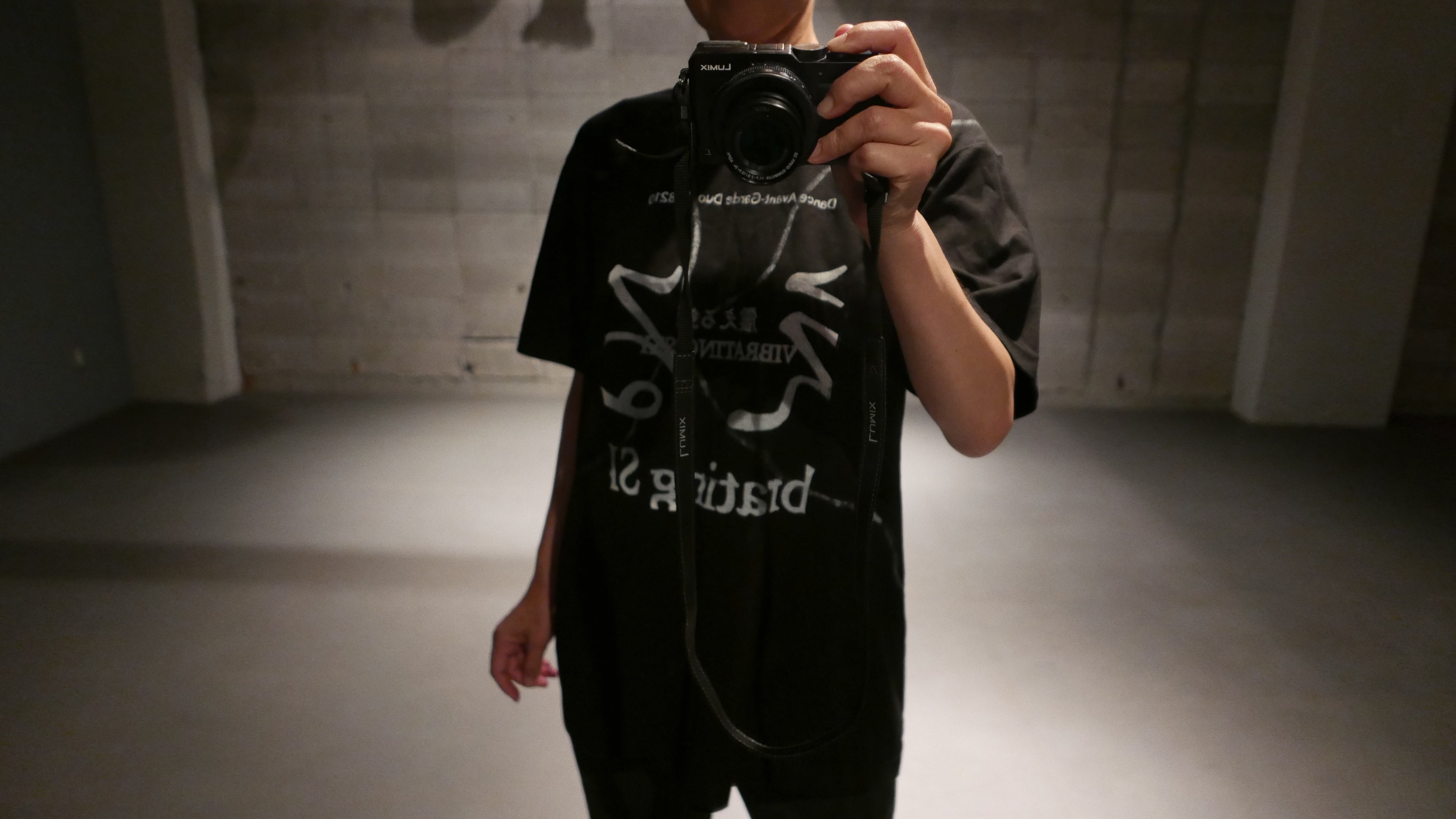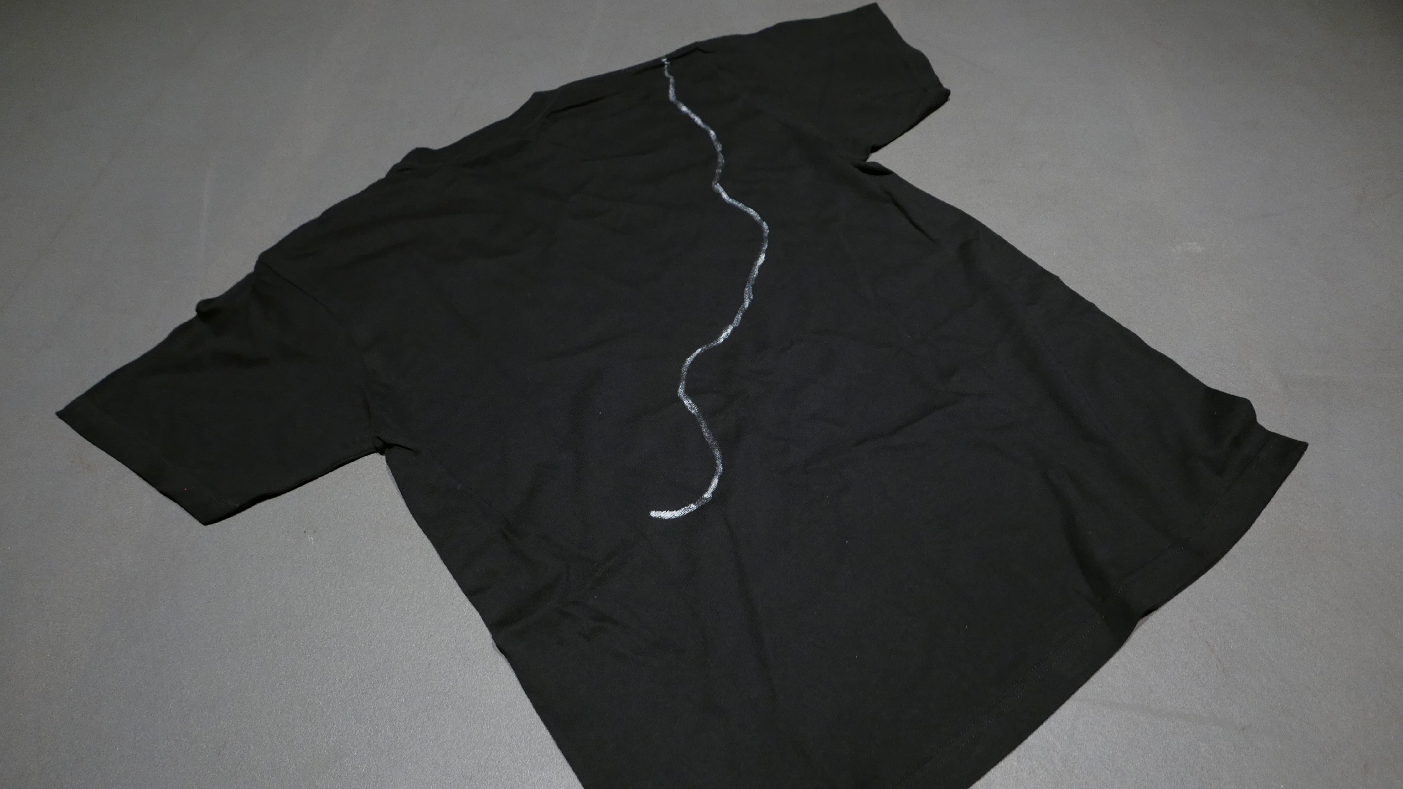 前見頃から後ろ見頃にかけてシルバーのラインが繋がっています。舞台上で使用するテグスのラインをイメージしております。ダボっと着ても、ピシッと着ても良い感じです。