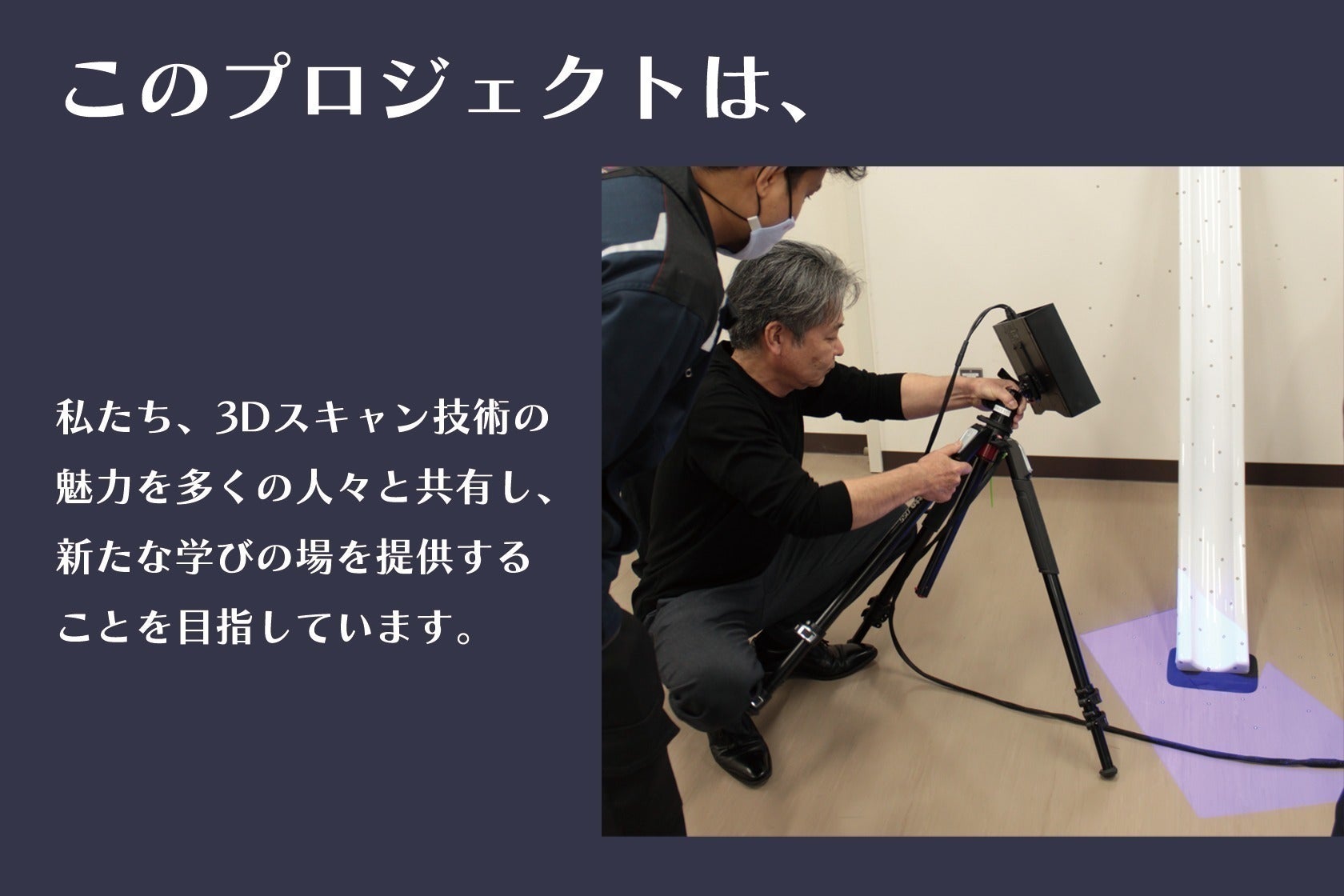 私たちは、3Dスキャン技術を学べる場を提供するプロジェクトを立ち上げるために、様々な活動をしてきました。また、多くの方々からアンケートをとり、メソッドが無い、3Dスキャンを学べる場所が無い為、販売社の操作説明や独学でチャレンジしている状況だと知りました。エンジニアの方はもちろん、クリエイターの方々にも、多くの事にチャレンジしてもらいたいと熱意と情熱を持って活動を進めてきました。これまでの準備では、業界の専門家と協力しカリキュラムの構築を進め、工業高等専門学校の協力により、特別課外授業も行いわせていただき、参加学生の皆様に最高の学びを得られるよう、細部に至るまで丁寧に準備を進めています。実際の活動拠点の選定も進行中です。