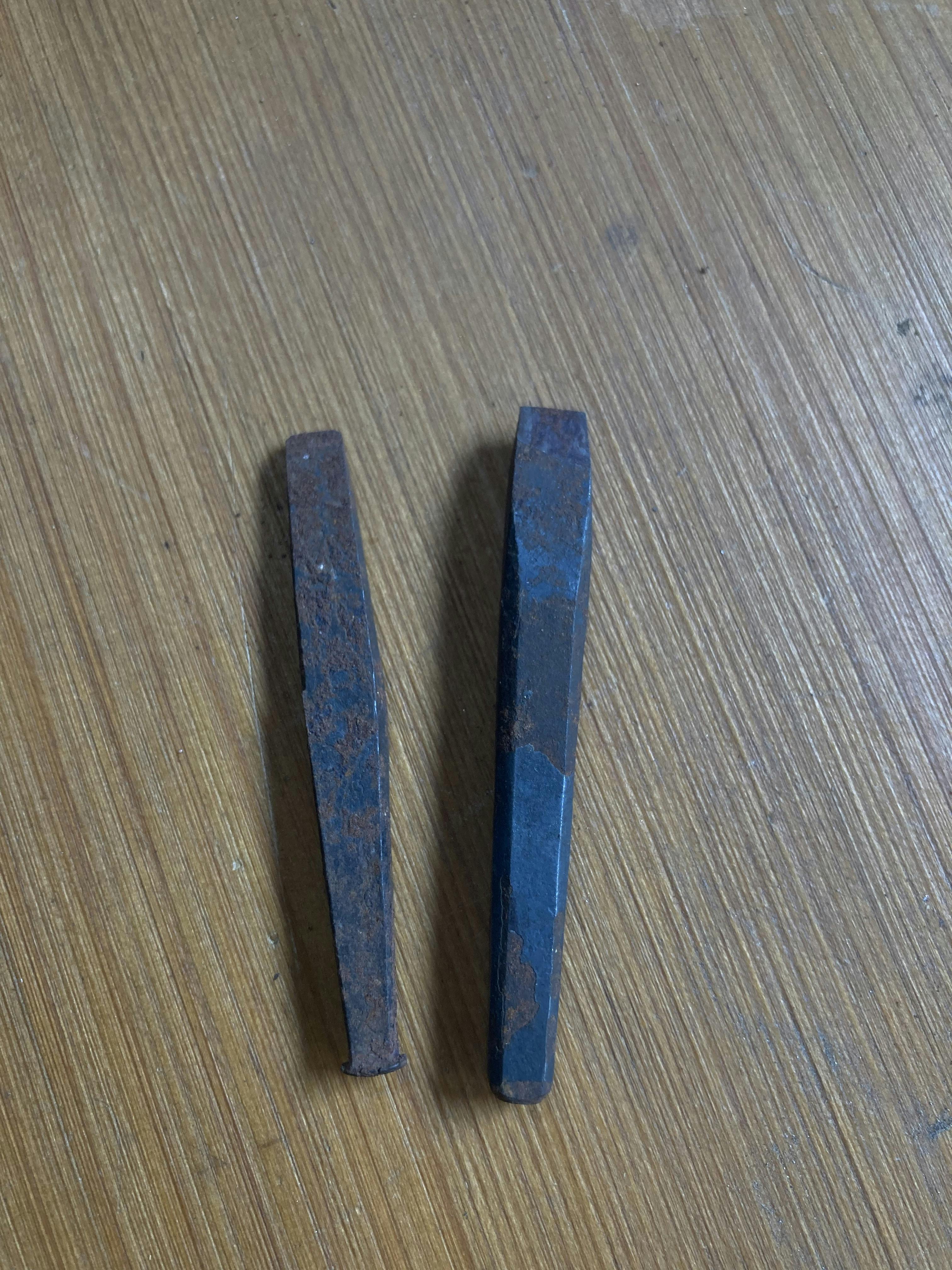2024/06/16 09:18今日は柄(エ=ハンドル)作りです。二つに割った木材を貼り合わせる方法で製作します。 胴和(口金)柄の口元に補強の為に金属で輪っかを作りはめます。(昔の絵には胴和は無いです。)ロウ付けという方法です。銀を流して金属をくっつける方法です。日本刀にもロウ付けでつくる部品があります。現代では鍛接の替わりにロウ付けが使われた刃物があります。時代を遡ると天智天皇の時代千三百年前の下水菅の工事にもロウ付けの跡がみられるという事で。そんな昔にハイテク技術があったのか!という記事を見ました。「驚異のハイテク技術 天智天皇の水時計を機能させた銅管 (日本銅センター)より」((私の先生は自身の入れ歯を、銀材とロウ付けを駆使して自分で製作して長年愛用しています。なんでも普通の入れ歯だと軽くて外れ易くて、海に潜った時良く無くして困ったそうです。銀は体にも害無く、重さがあるので外れてなくす事が無くなったそうです。そして歯の形に興味を持ち、歯の構造や調整の事など講義して頂きました。))と言うわけで完成した柄です。防水の為に木部に塗りをしています。 もっと見る