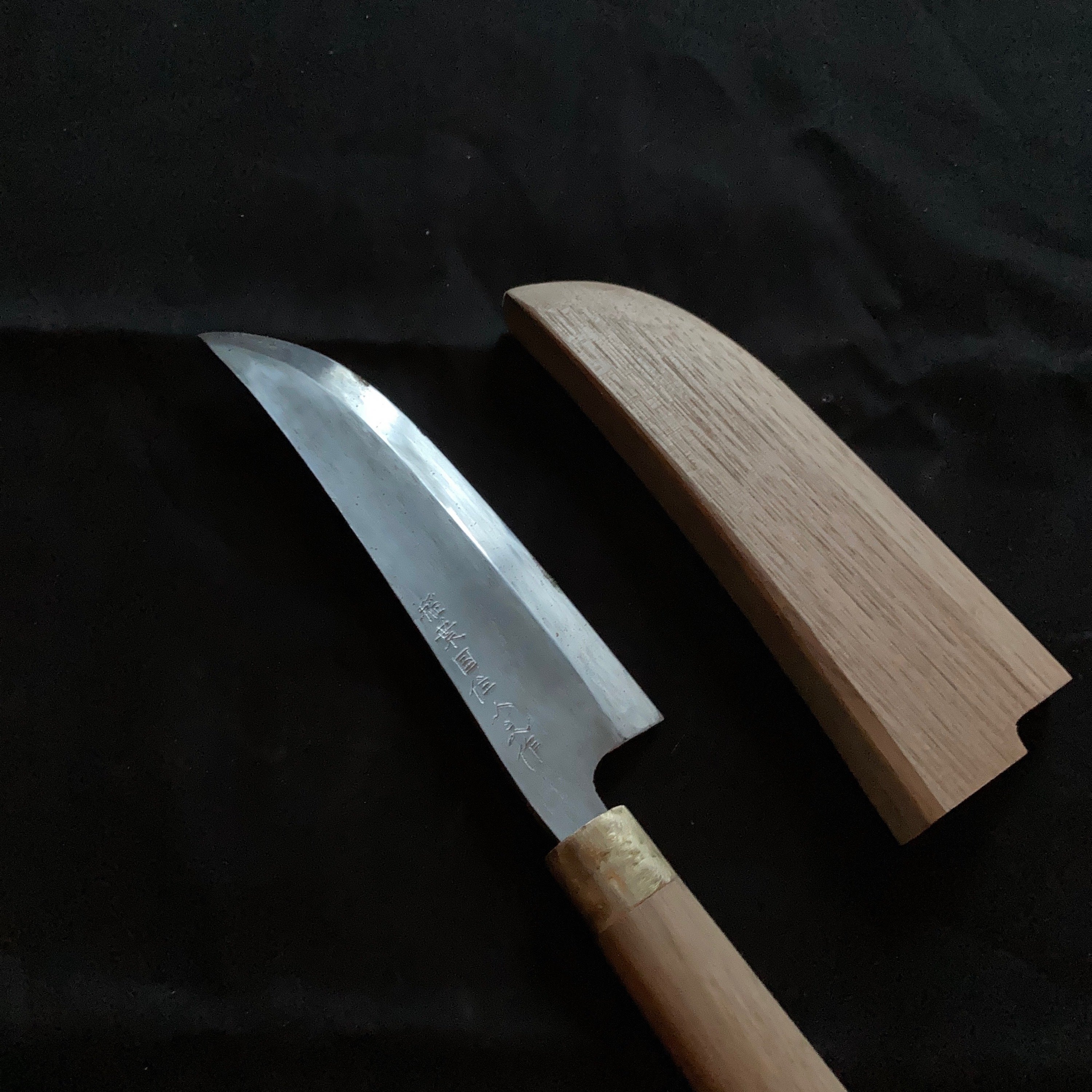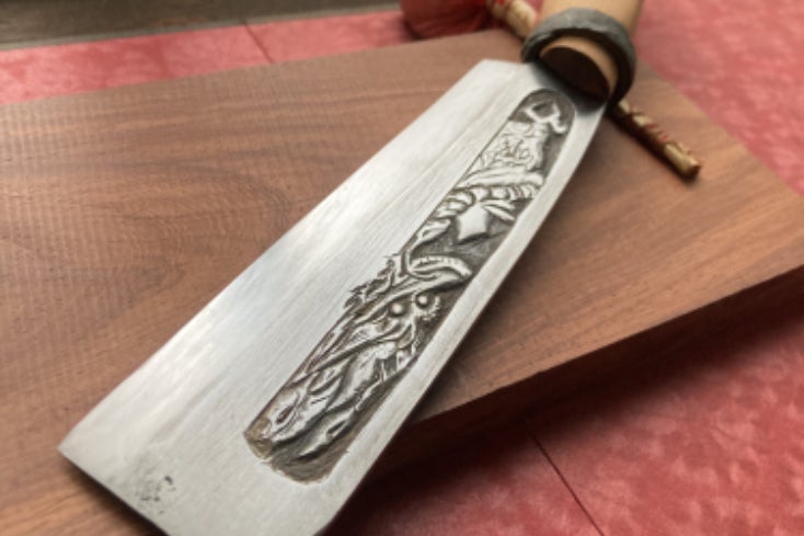 2024/06/11 13:32銘切は、鍛冶屋が製品に名前を刻む事をいいます。日本で、はじめて銘を切ったとされるのが鳥取の刀工安綱の銘 安綱(平安期)これは収集したものです。鳥取の鍛冶屋さんの銘切タガネ。 すべて自作し、形も大きさも違います。銘切タガネも自身で研究し作ってゆくしかありません。 一番最後の仕上げが銘切です。今までどの工程も一発勝負です。下書き。切り進めていきます。 この形の包丁、とても使いやすいです。 これは古の包丁を参考にしています。それを薄い片刃で再現したものです。このカーブを切っ先といいます。 例えば、肉を薄くおろす時、この切っ先がスプーンですくうようにして切れていきますから、画像の半解凍の肉がスイスイおろされ、仕事が進みます。スイカなんかもつるんといけます。千切りも問題ありません。魚なども捌くとき、最初に切っ先があることできっかけになり、そこから刃が進むという事になります。 (切っ先がスプーンのようになってサクサクおろしてしまいます。 )この手の包丁を探し始めて10年程になります。大昔の人はどんな包丁を使っていたのかと思いまず骨董屋さんを探していましたがありませんでした。某オークションでも一度しかそれらしい包丁は見かけた事がありません。1番近かったのが桑切包丁とかつお包丁、式包丁、刀子、名物包丁正宗などです。絵の中には頻繁に登場します。水気に晒される物ですから現物は残らなかったのかも知れません。或いは皆さんの実家などに残っているのかも知れません。現代は漫画やイラストにこの手の包丁がよく登場します。 もっと見る