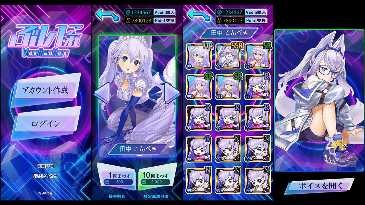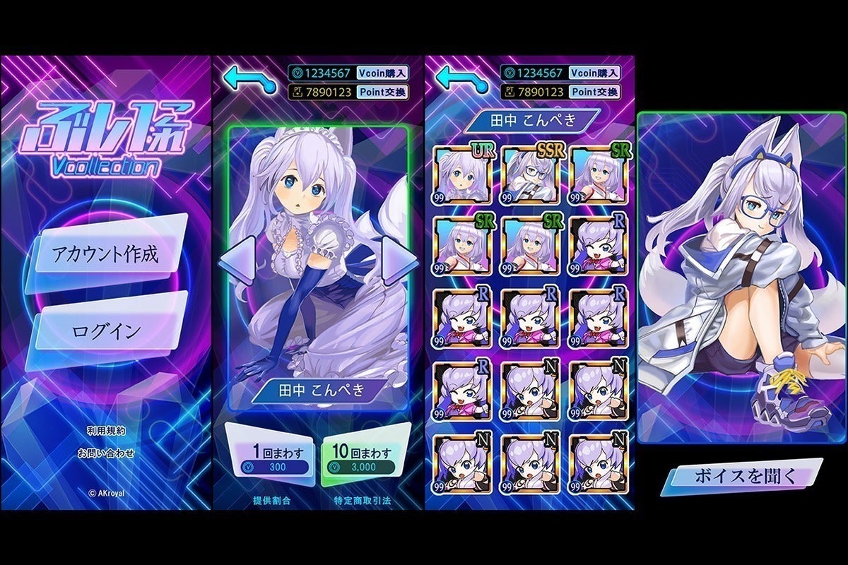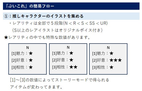『ぶいこれ』はVtuver(ライバー)さんをモチーフにしたゲームアプリです。①推しキャラクターのイラストを集める②集めたイラストを3枚セットする事でストーリーが変化する新感覚ストーリーモード③レアリティ/ポイントが高いイラストをセットすると高確率でレアアイテムゲット。などが楽しめます。