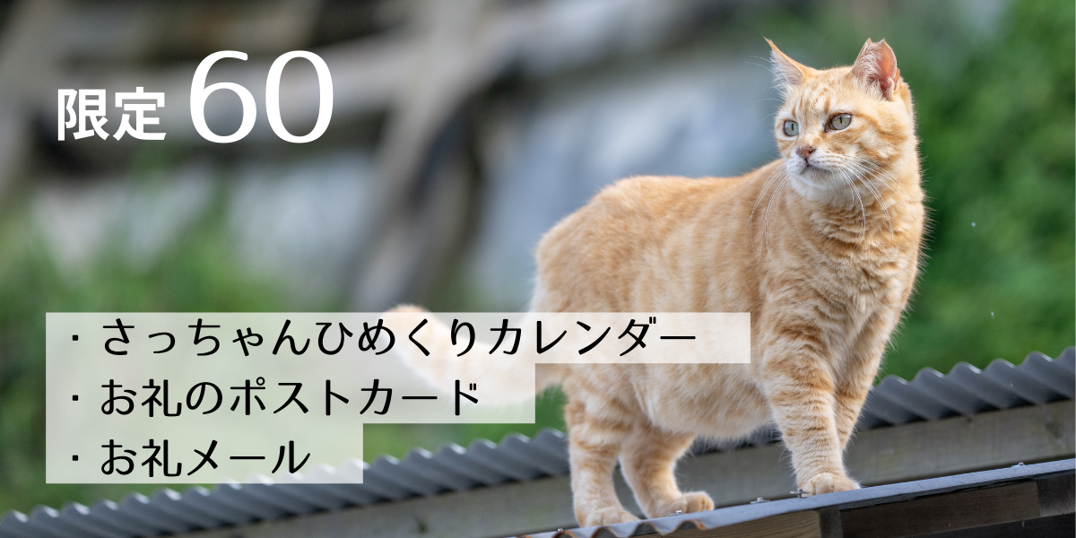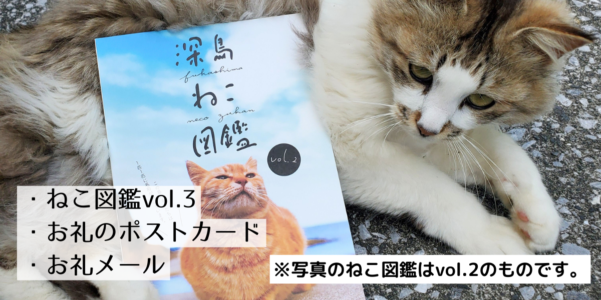 ・ねこ図鑑、深島オリジナルにゃんこクッキー、お礼のポストカード、お礼メール