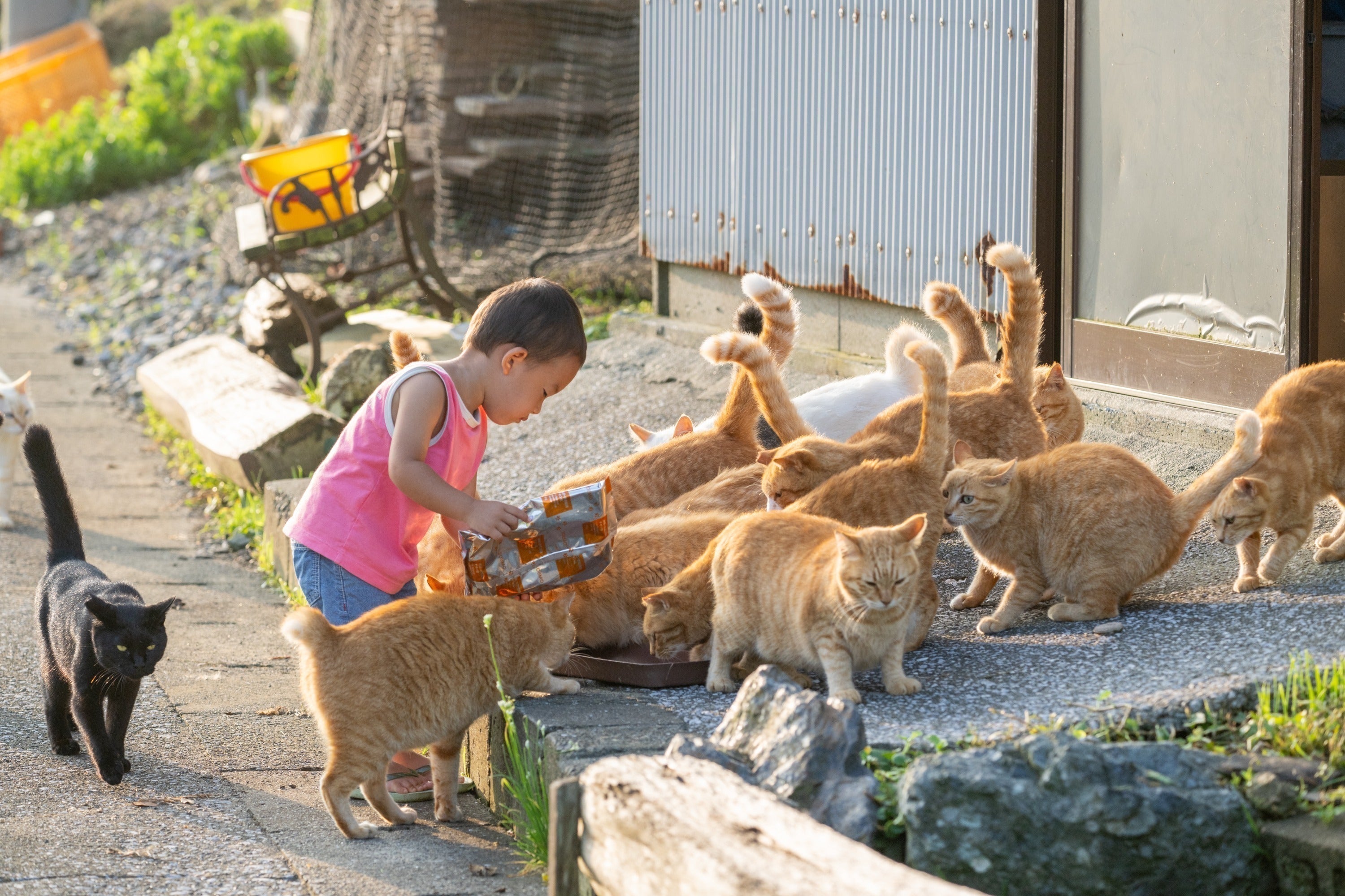 現在深島では、ねこたちにごはんとしてキャットフードをあげていますが、以前は島のおじさんたちが人間のごはんを分けており、全てのねこたちのごはんを賄いきれていませんでした。ご存知のように、ねこに人間のご飯をあげるのも良くないですよね。