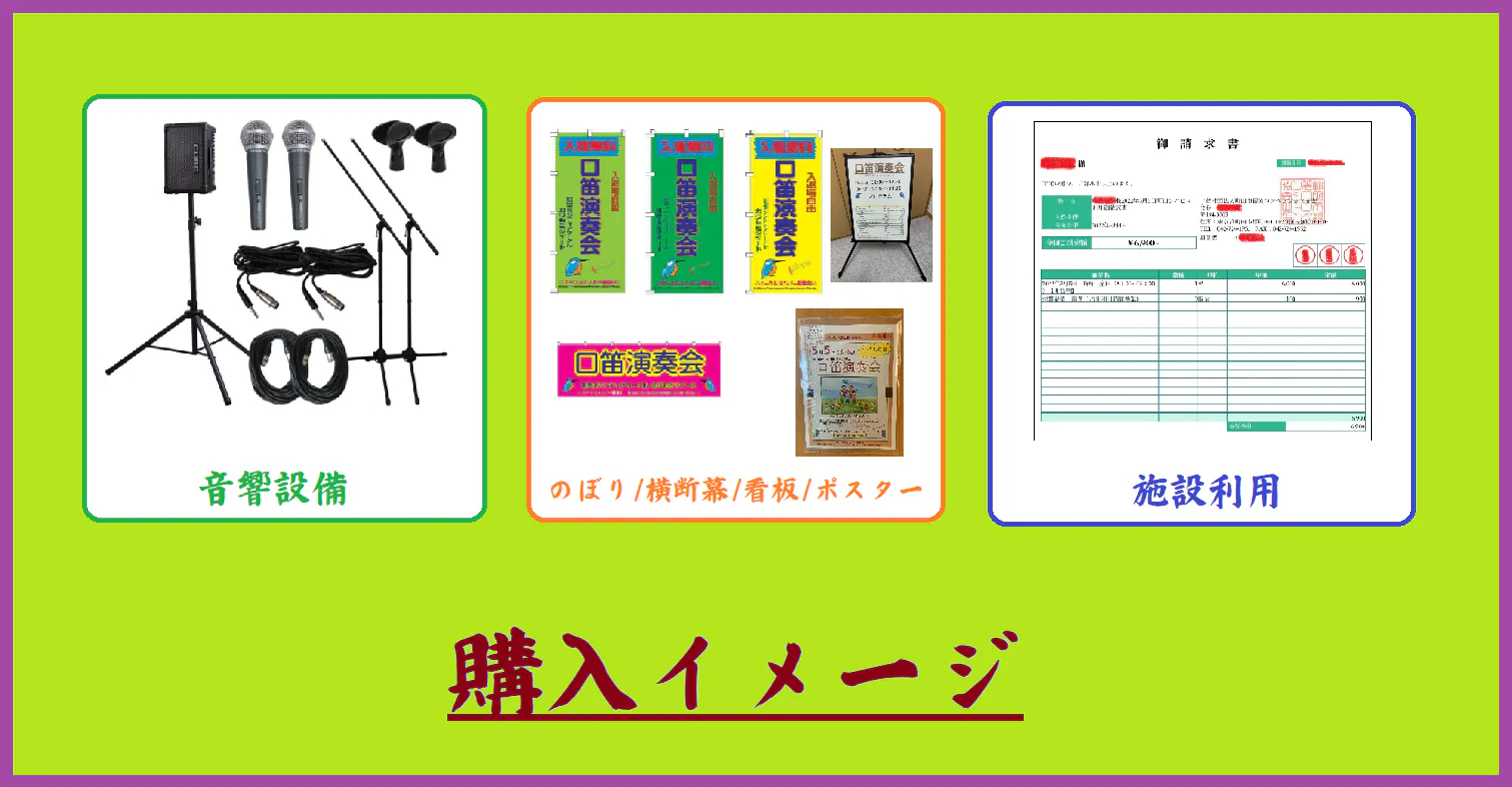 壊れた音響設備(スピーカー、マイク、各種ケーブル 等)の購入費と、施設利用料やのぼり・看板・ポスター制作費等 に当てさせていただきます。
