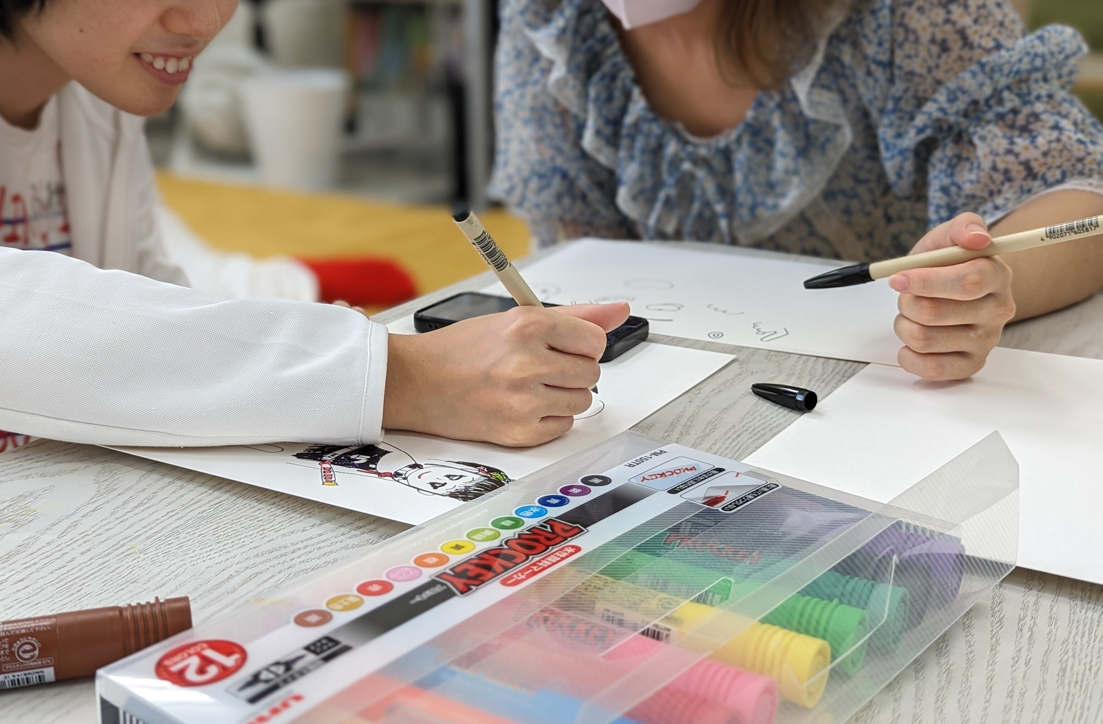放課後等デイサービス ルームズでは、2022年4月から九州産業大学 生活環境デザイン学科の青木幹太 教授のご協力をいただき、九州産業大学の学生の方々と共同での取り組みを始めています。内容としては、子どもたちが作成したイラストや作成物を学生の方々が子ども達と対話し、ルームズの子供たちと学生のインスピレーションのコラボによって、デザインを作成します。